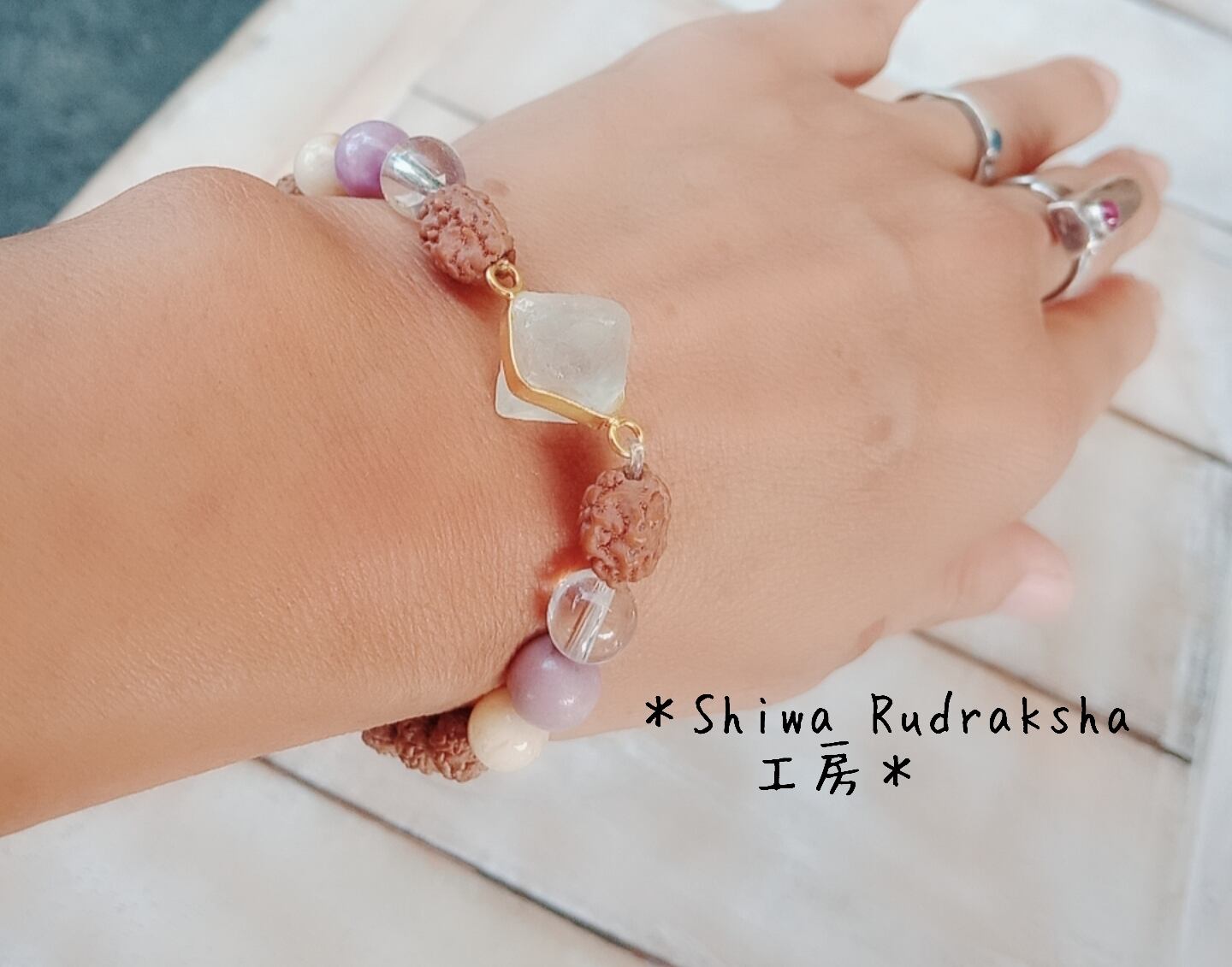 「フローライト原石」の横にはスピリチュアルライフには欠かせない、ヒンドゥー3大神が内在すると言われる「ルドラクシャ3面」を左右に入れています。