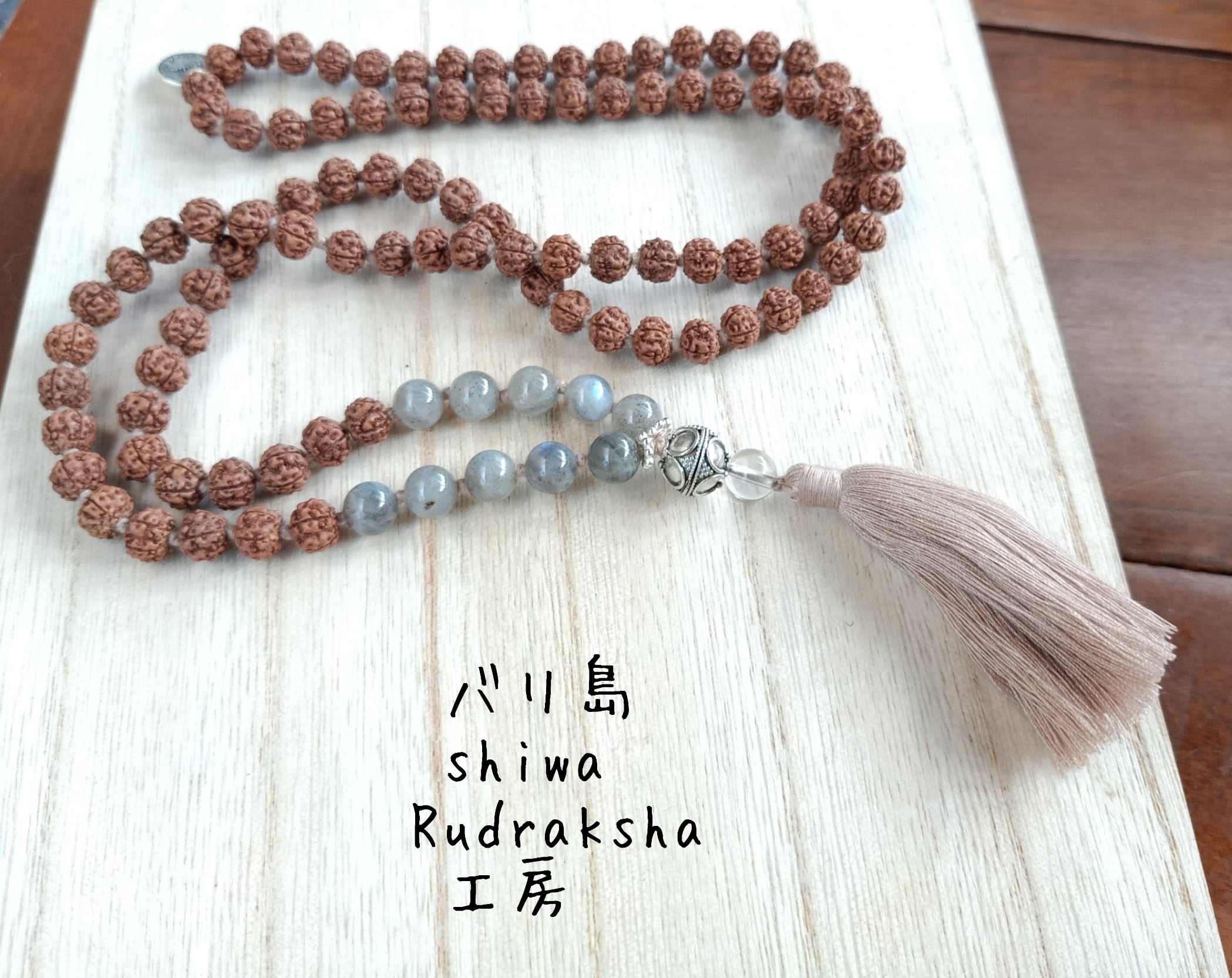 マントラを唱えるのにも最適なサイズのルドラクシャ8mmと、「ラブラドライト」8mmを使用しています。