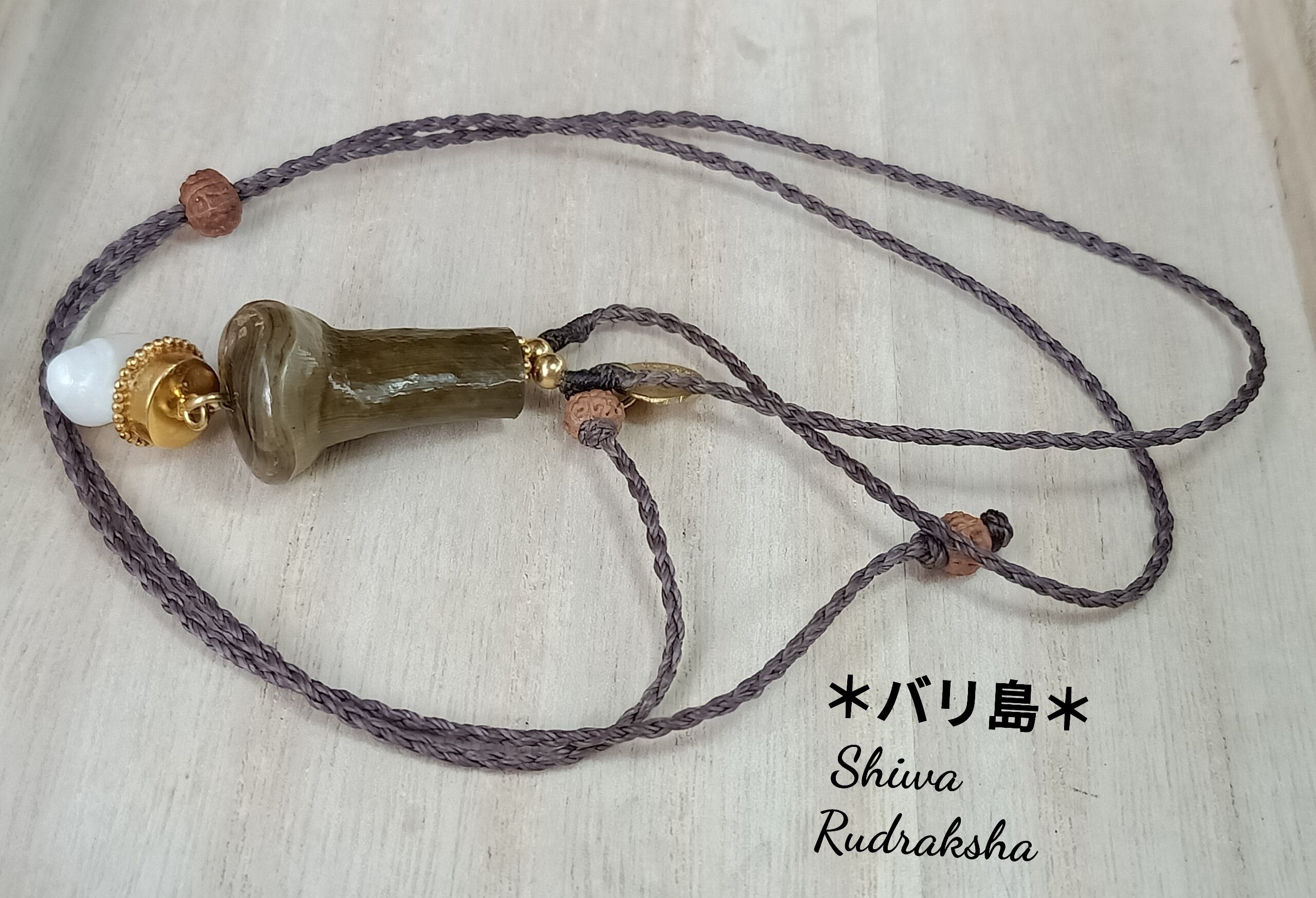 シルバー加工した「ケオン」と「グリーンウリヌサ・インドネシア産」の根っこの部分をペンダントトップにして、「ルドラクシャ7面」を組み入れた調整可能なマクラメの紐ネックレスです。