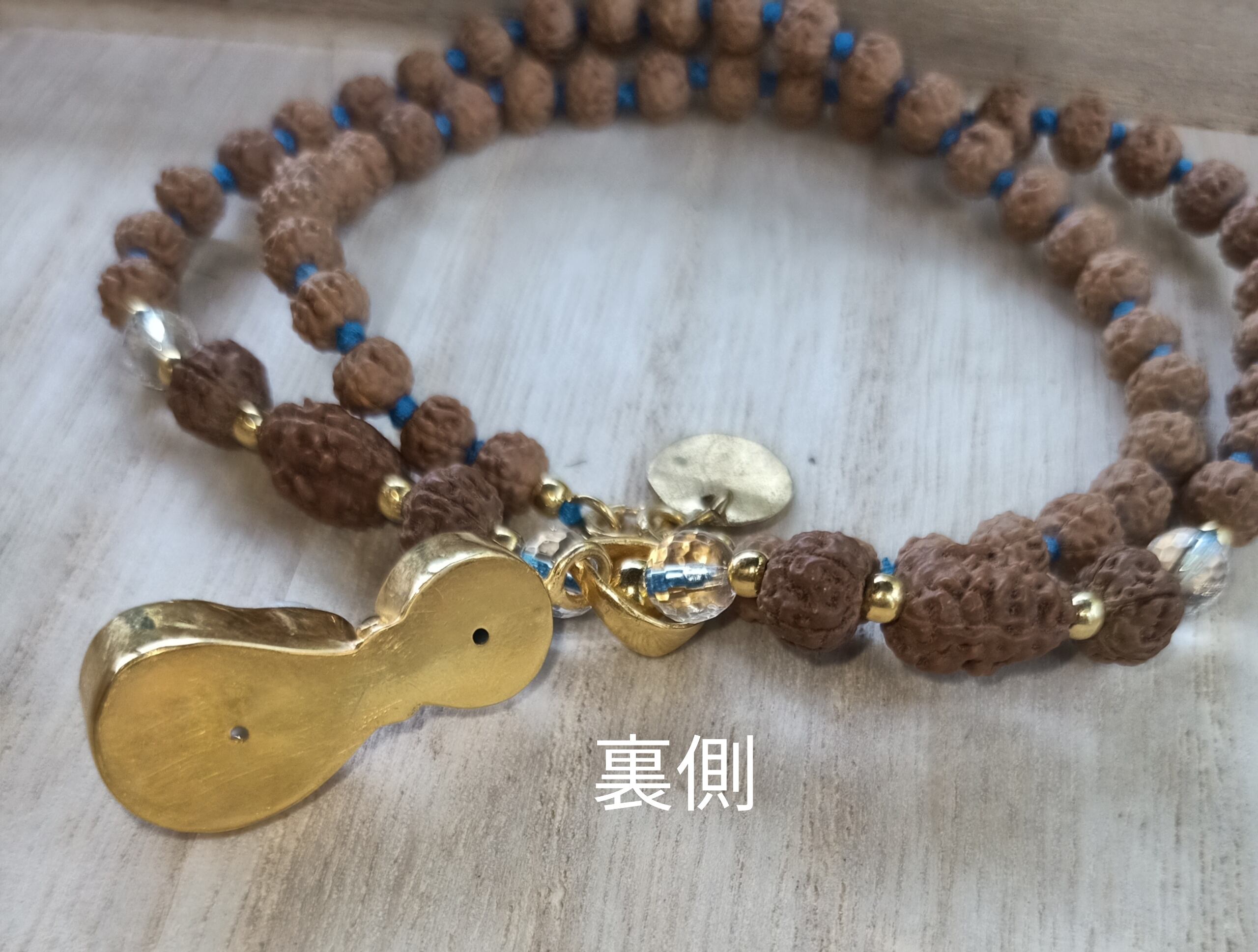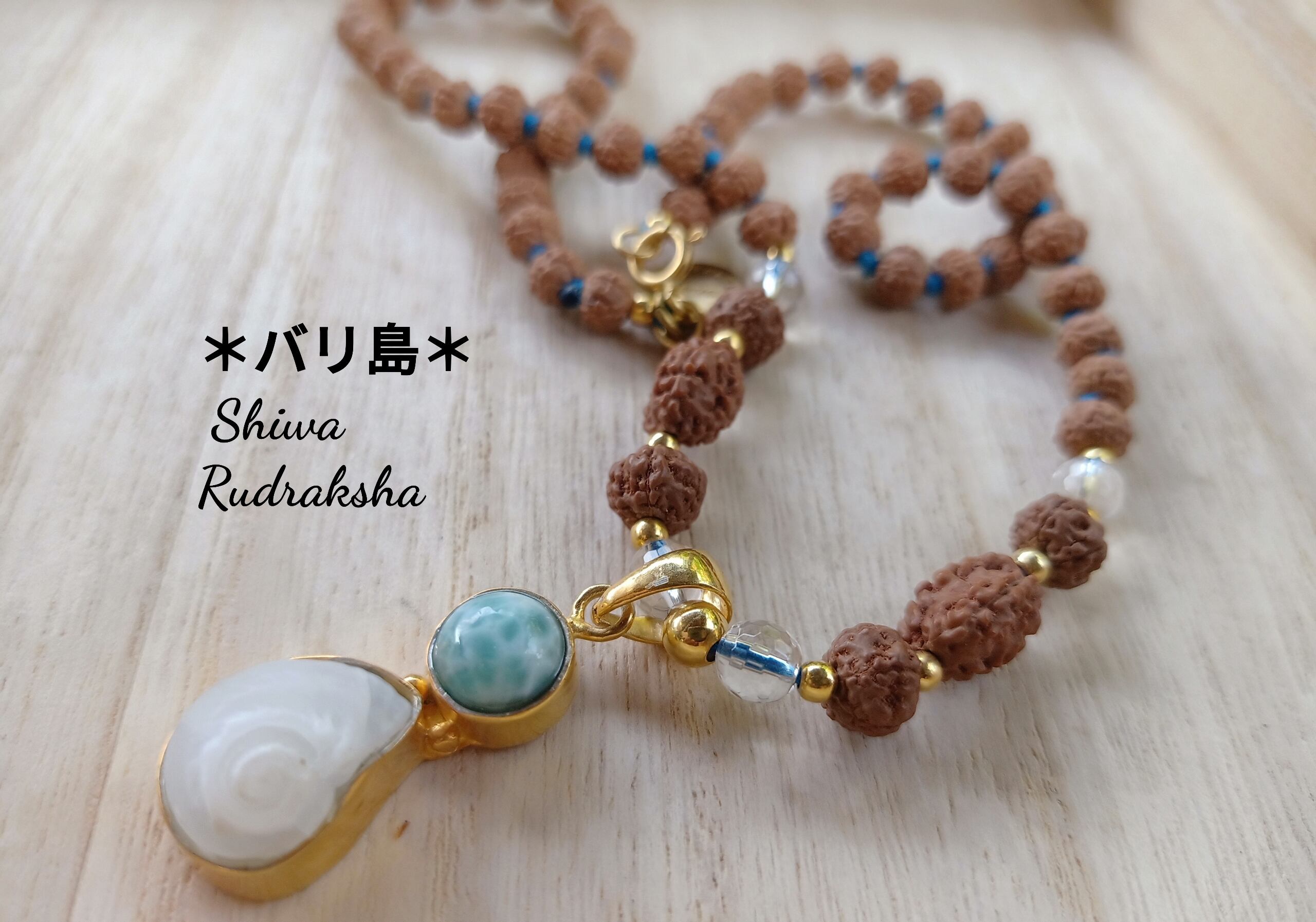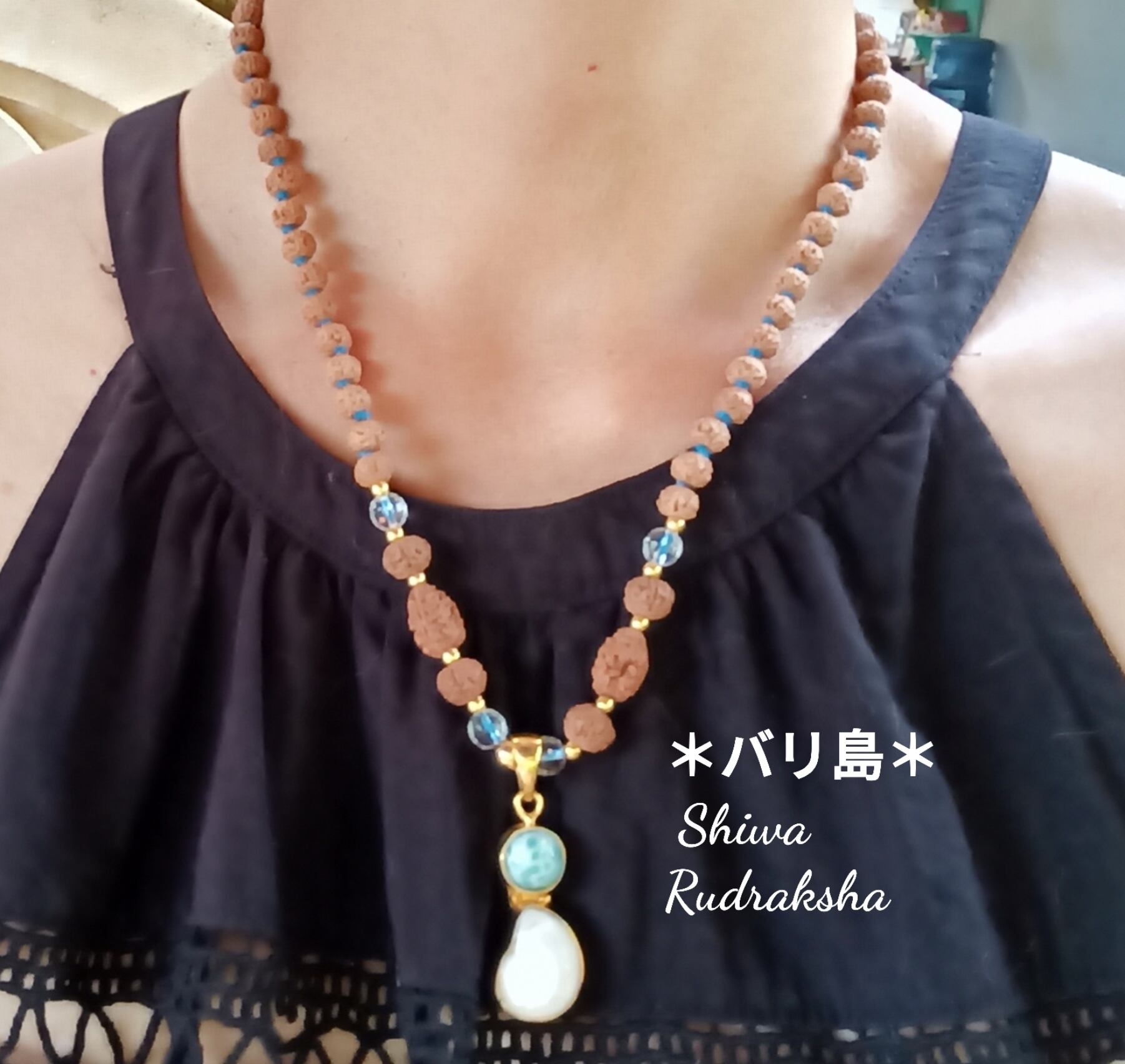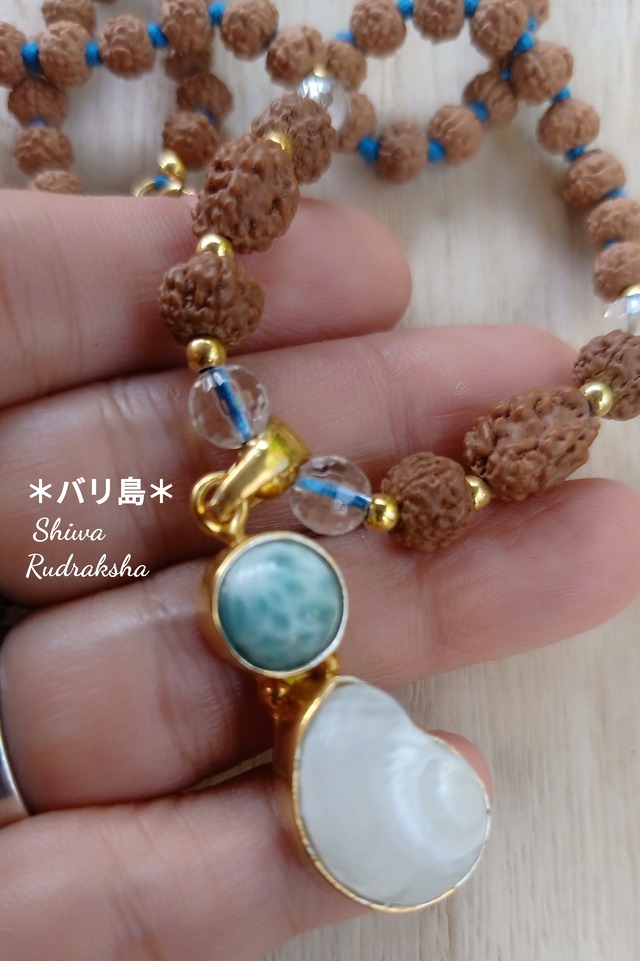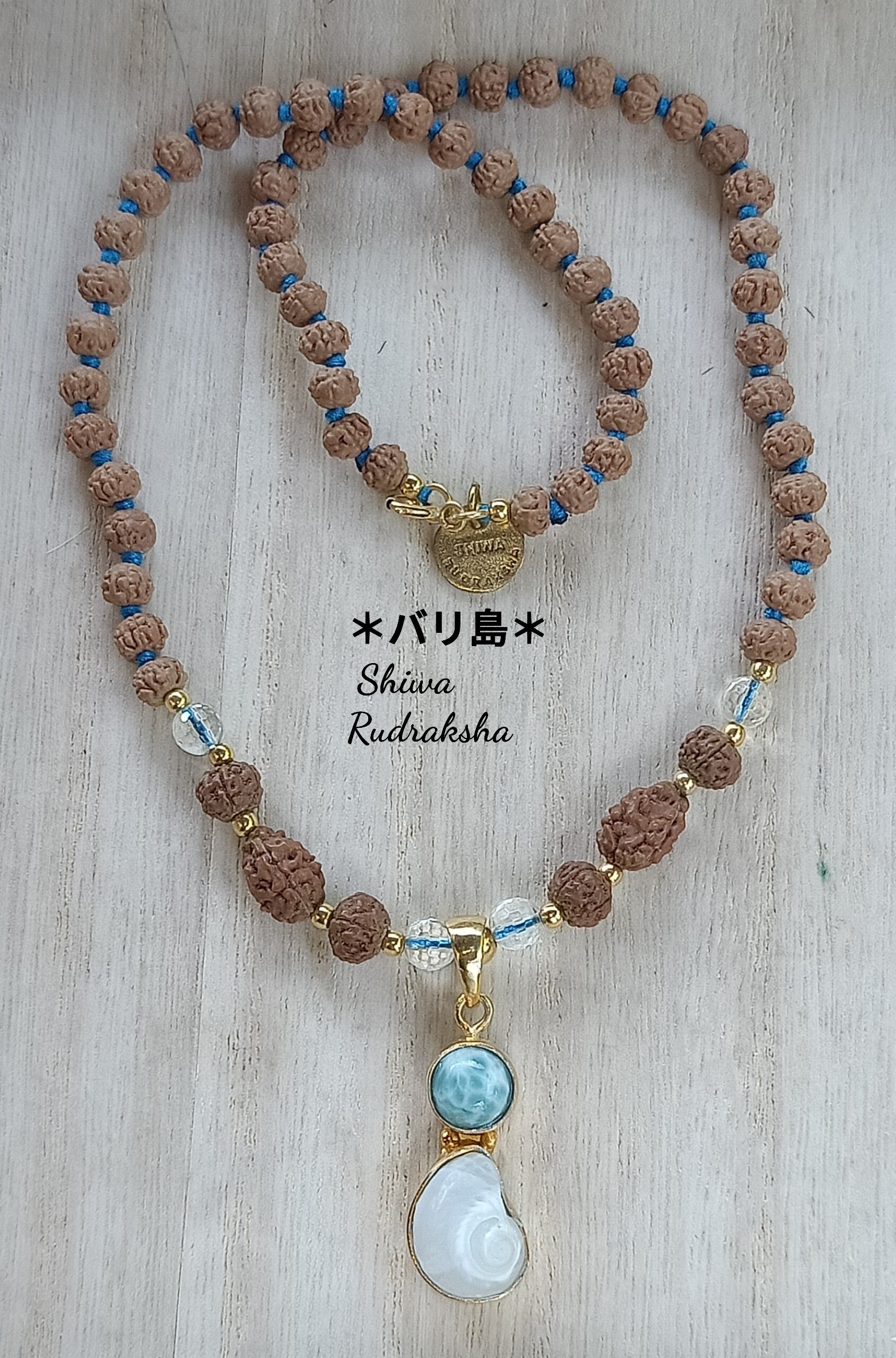 特注オーダーした「ケオン&ラリマー装飾」のペンダントトップに、ルドラクシャ3面入りのノット(結び)タイプのネックレスです。