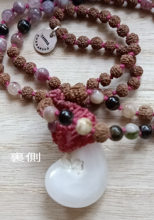 ルドラクシャは「人間関係を円滑にし、夫婦円満や引き寄せ」を願う2面(シヴァ&パールヴァティ)をケオン横に1粒ずつ左右に入れ、トルマリン3粒の上に「7面ラクシュミー女神」も組み入れました。
