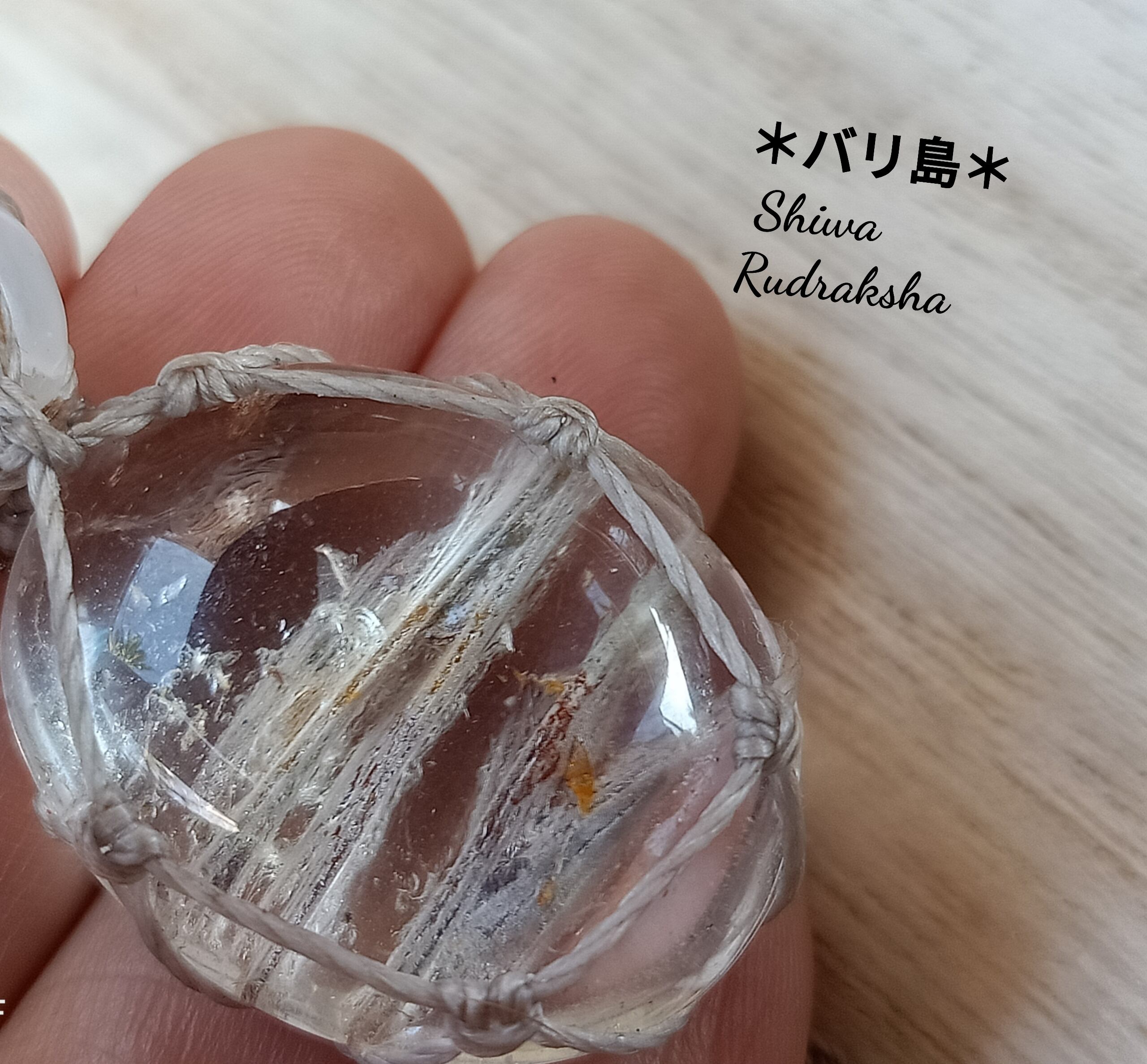 ★ルドラクシャ3面(約縦11mm)・クリスタル(約6mm)・ゴールドウリ(約8mm)・ケオンのカボション(約17mm:自然のクラック(割れ)あります。)・ホワイトアメジスト(約縦29mm)・ウッドビーズ(約6mm&8mm)
