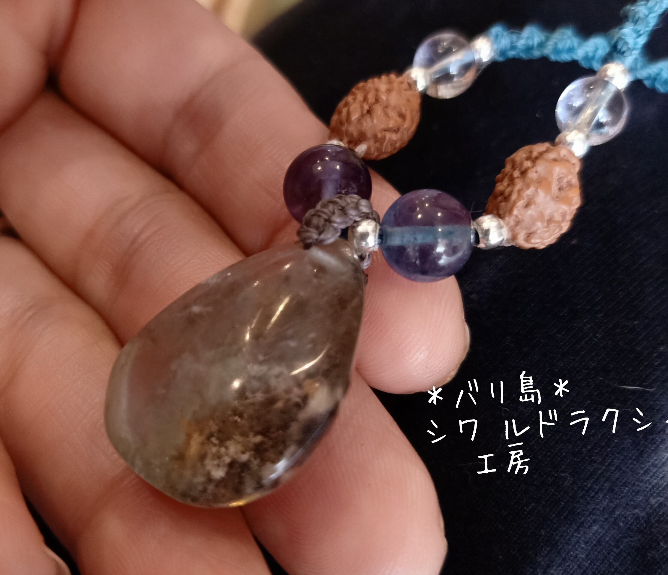 ★ルドラクシャ3面(縦約11mm)・ドロップ型ホワイトアメジスト(約縦26mm)・シルバー925ビーズ(約3mm)・フローライト(約8mm)・氷種アメトリン(約6mm)