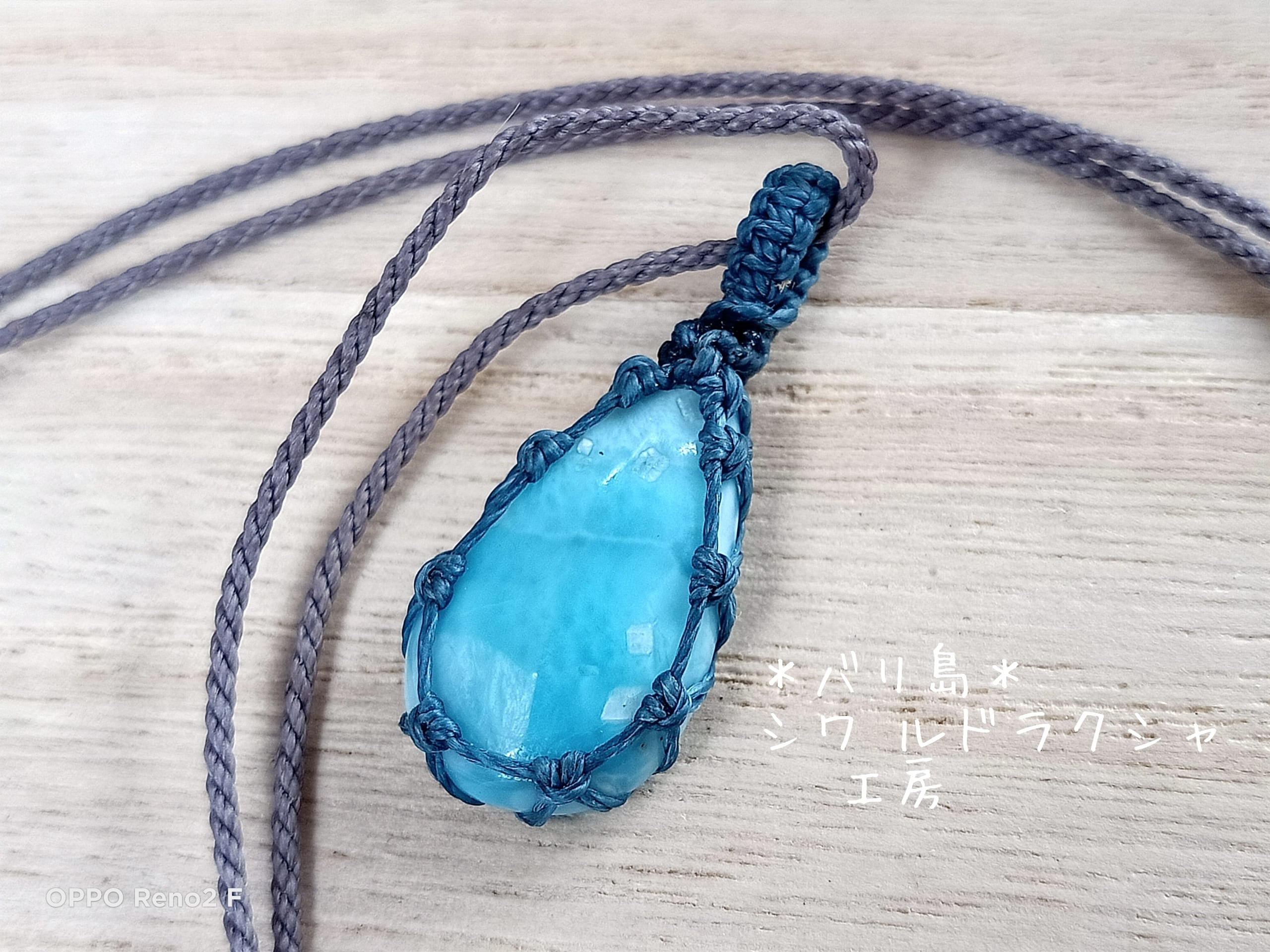 世界三大ヒーリングストーンの「ラリマー」をペンダントトップにしたマクラメ加工の組紐ネックレスです。