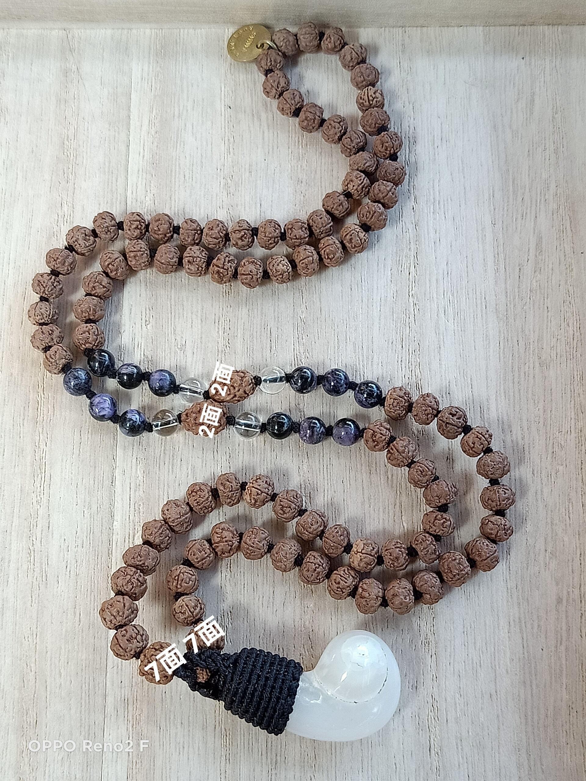 ★ルドラクシャ5面(約6㎜)・ルドラクシャ2面(縦約11mm)・ルドラクシャ7面(約8mm)・クリスタル(約6mm)・チャロアイト(約6mm)・ケオン(縦約34mm:薄い自然のクラック(ひび割れ)あります。)