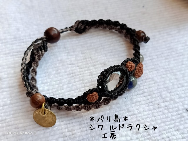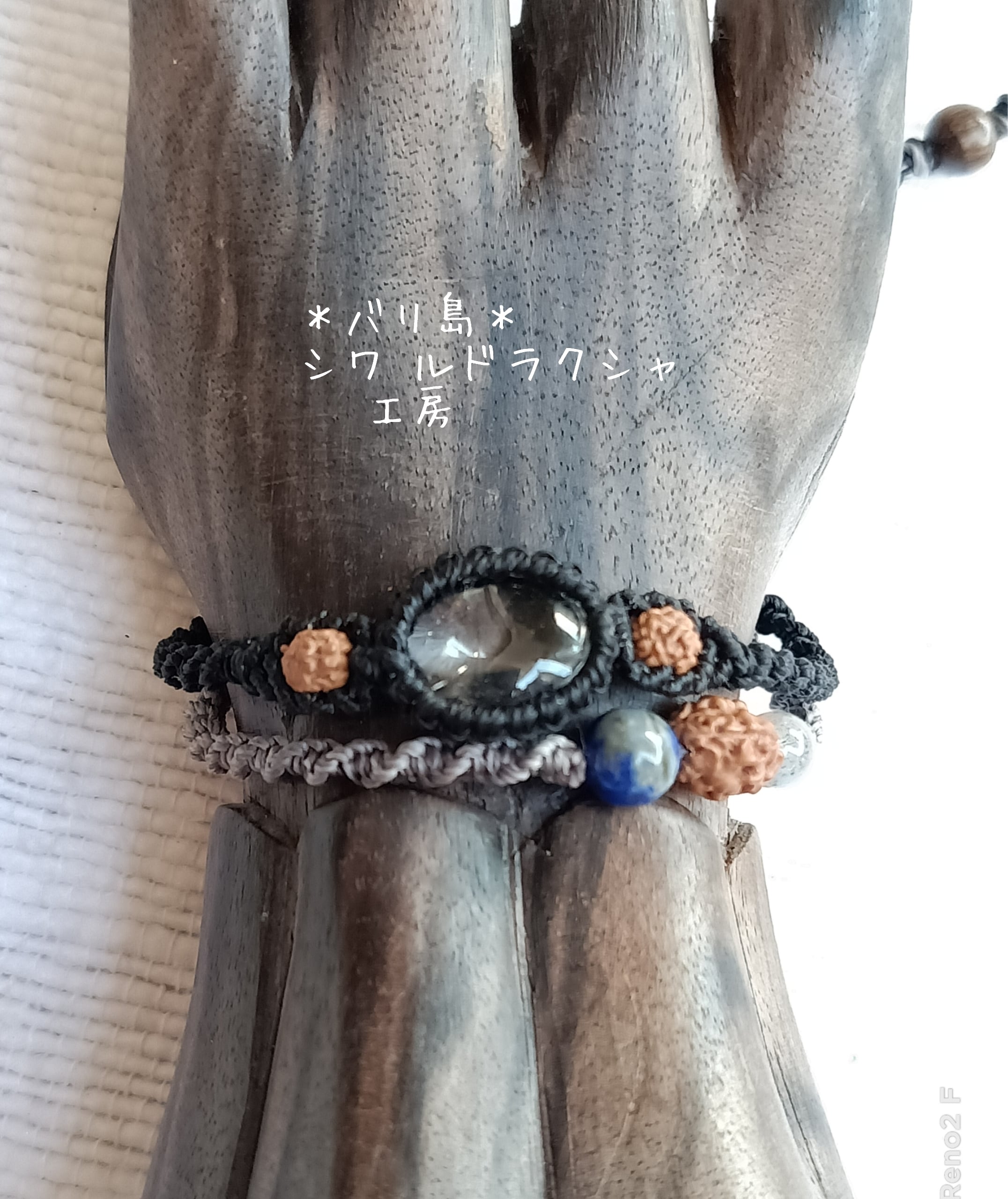 「ヒンドゥー三大神が内在する」と言われるルドラクシャ3面(アグニ)を1粒と、「神聖な波動を与える」と言われる小粒のルドラクシャ5面(ルドラ)をメインのインドネシア産「アメジスト」の両脇に組み入れた2連ブレスレットです。