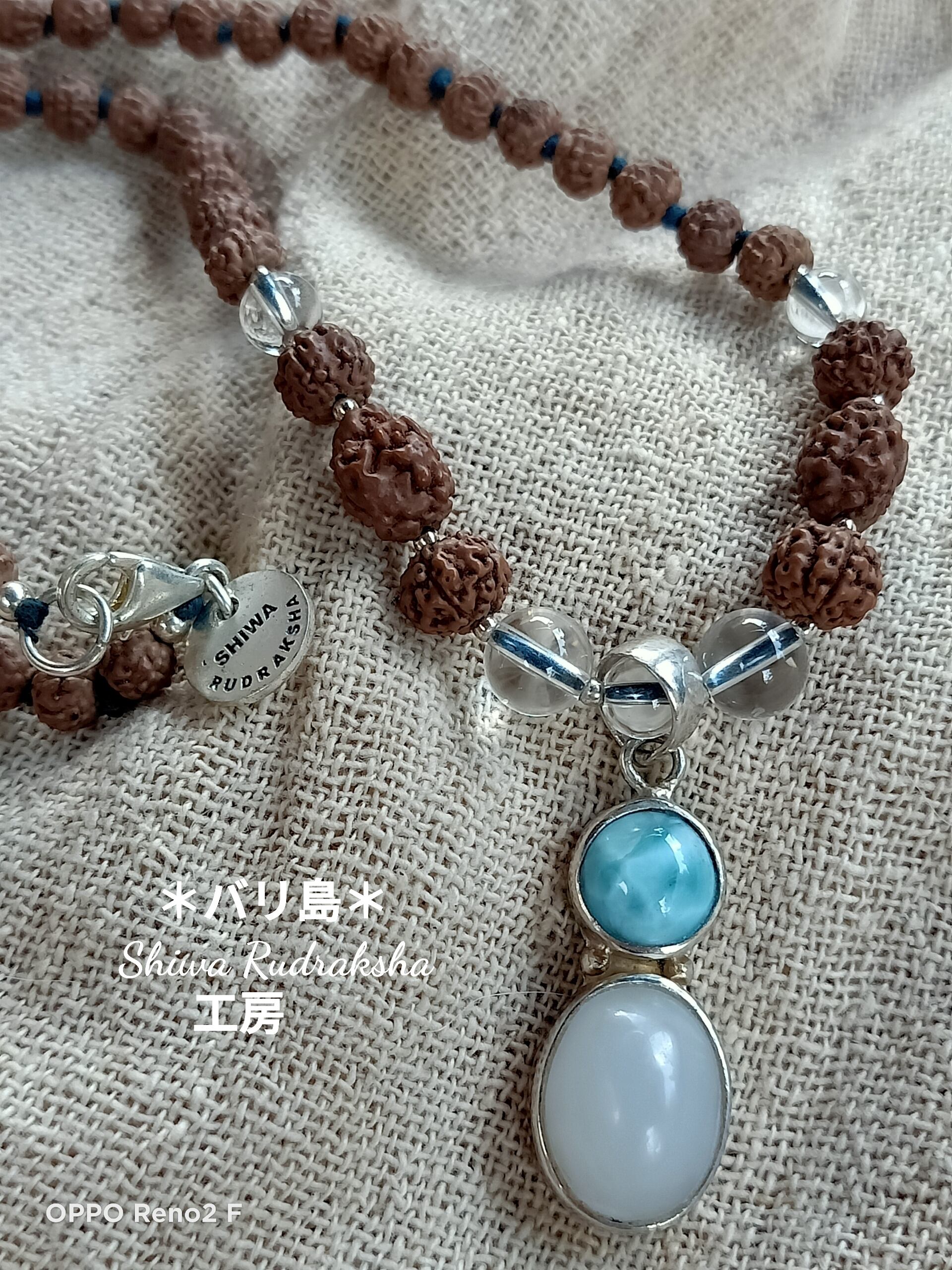特注オーダーした「ケオン&ラリマー装飾」のペンダントトップと、ルドラクシャ3面入りのノット(結び)タイプのネックレスです。