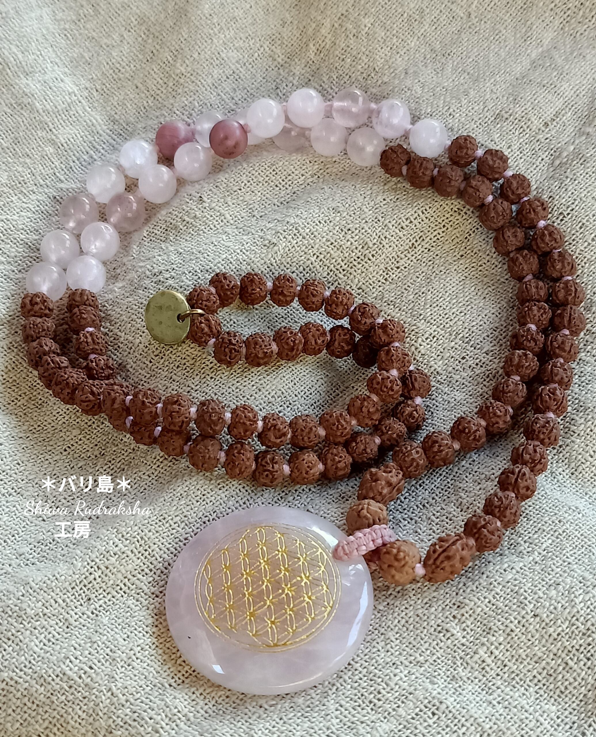 「フラワーオブライフ」の彫刻入りのパワーストーン「ローズクウォーツ」をペンダントトップにした108マーラーです。