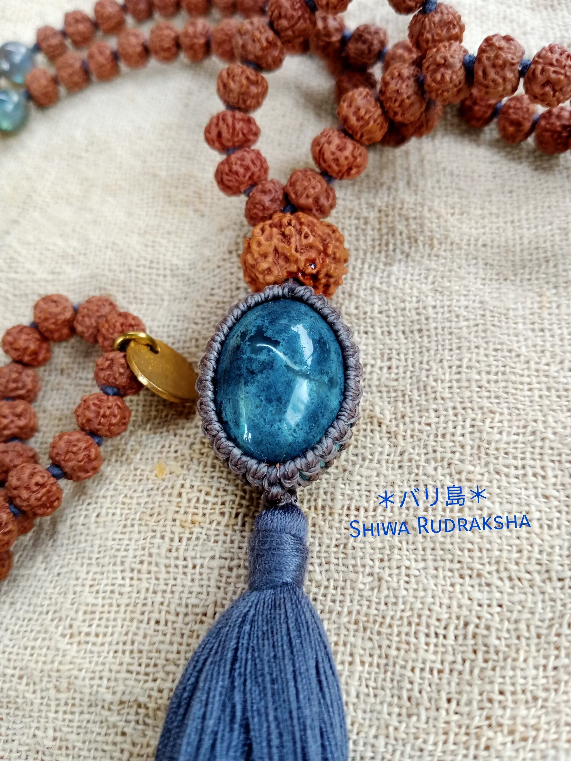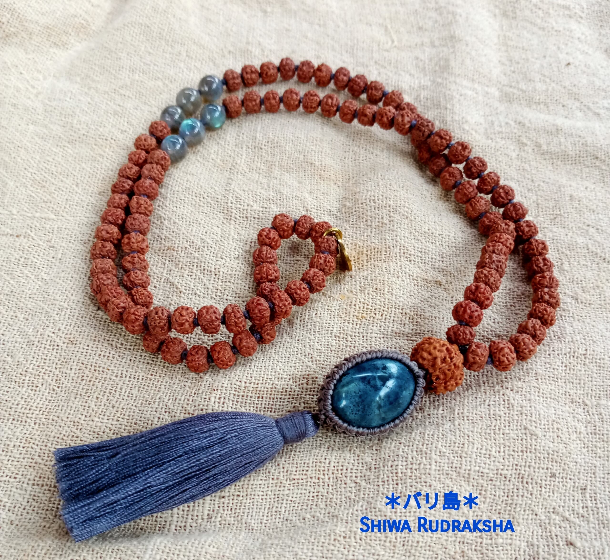 「ドゥルガー女神の祝福のもとにあり、愛と救済が与えられる」とされる9面ルドラクシャのグルビーズに、インドネシア産「アゲート」をペンダントトップにした108マーラーです。