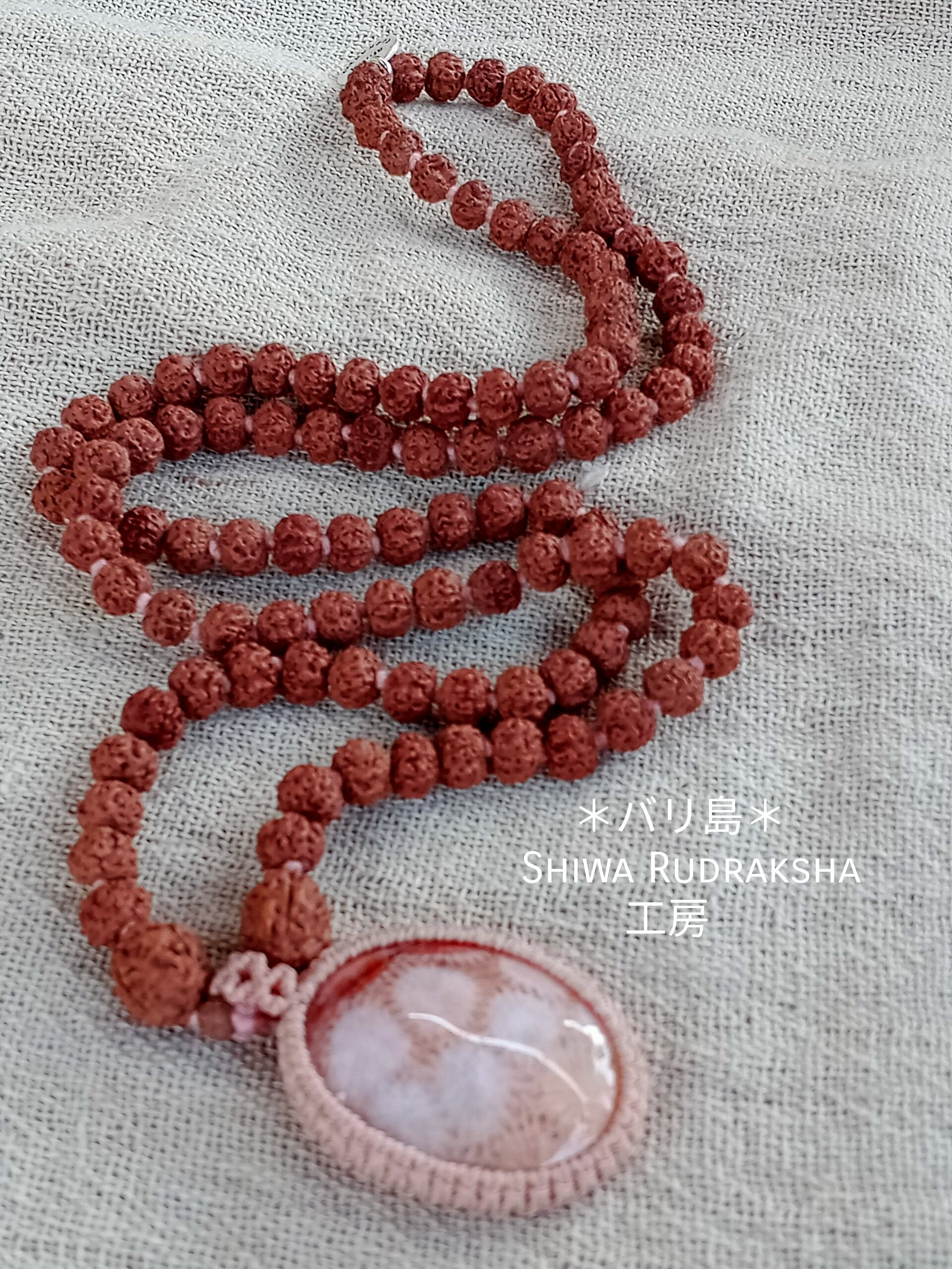 「インドネシア産」の「フォシルコーラル(珊瑚の化石)」をマクラメ加工し、ペンダントトップにした108マーラーです。