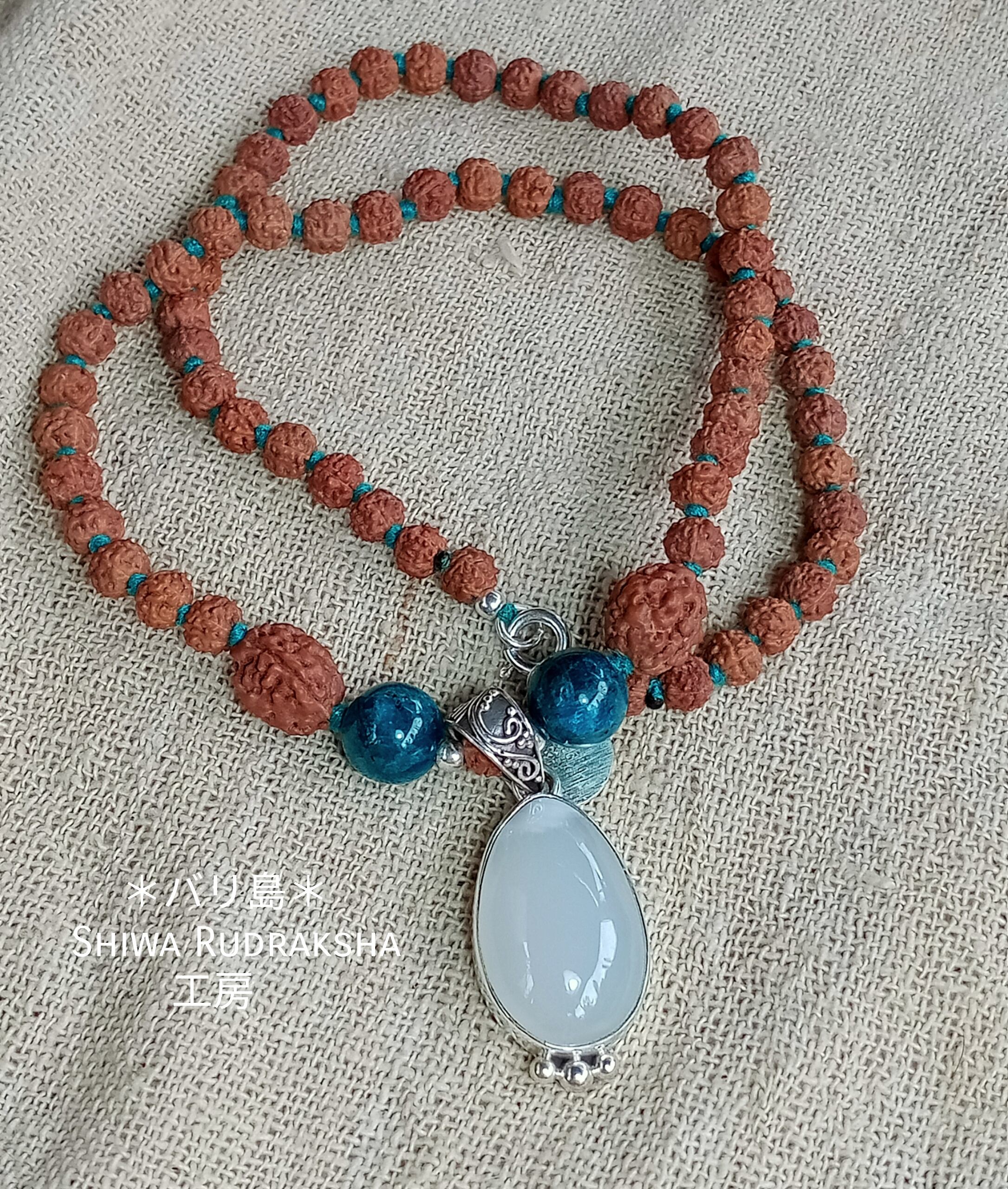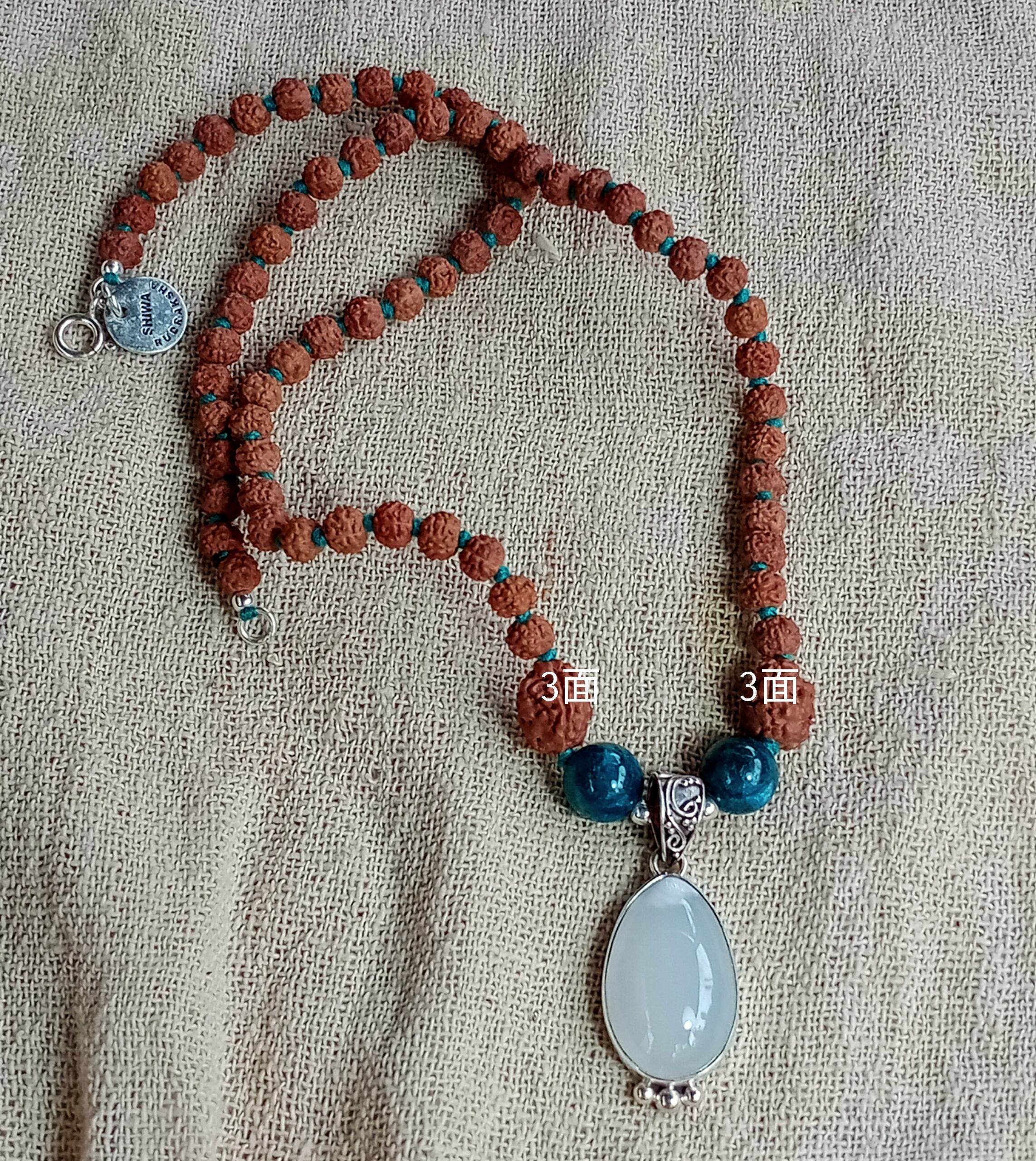 ルドラクシャは「ヒンドゥー三大神」が内在すると言われる「3面アグニ」をペンダントトップの左右に組み入れ、その他は「周りに神聖な波動を与え、チャクラに作用する。」と言われる、ポピュラーな「ルドラクシャ5面」です。