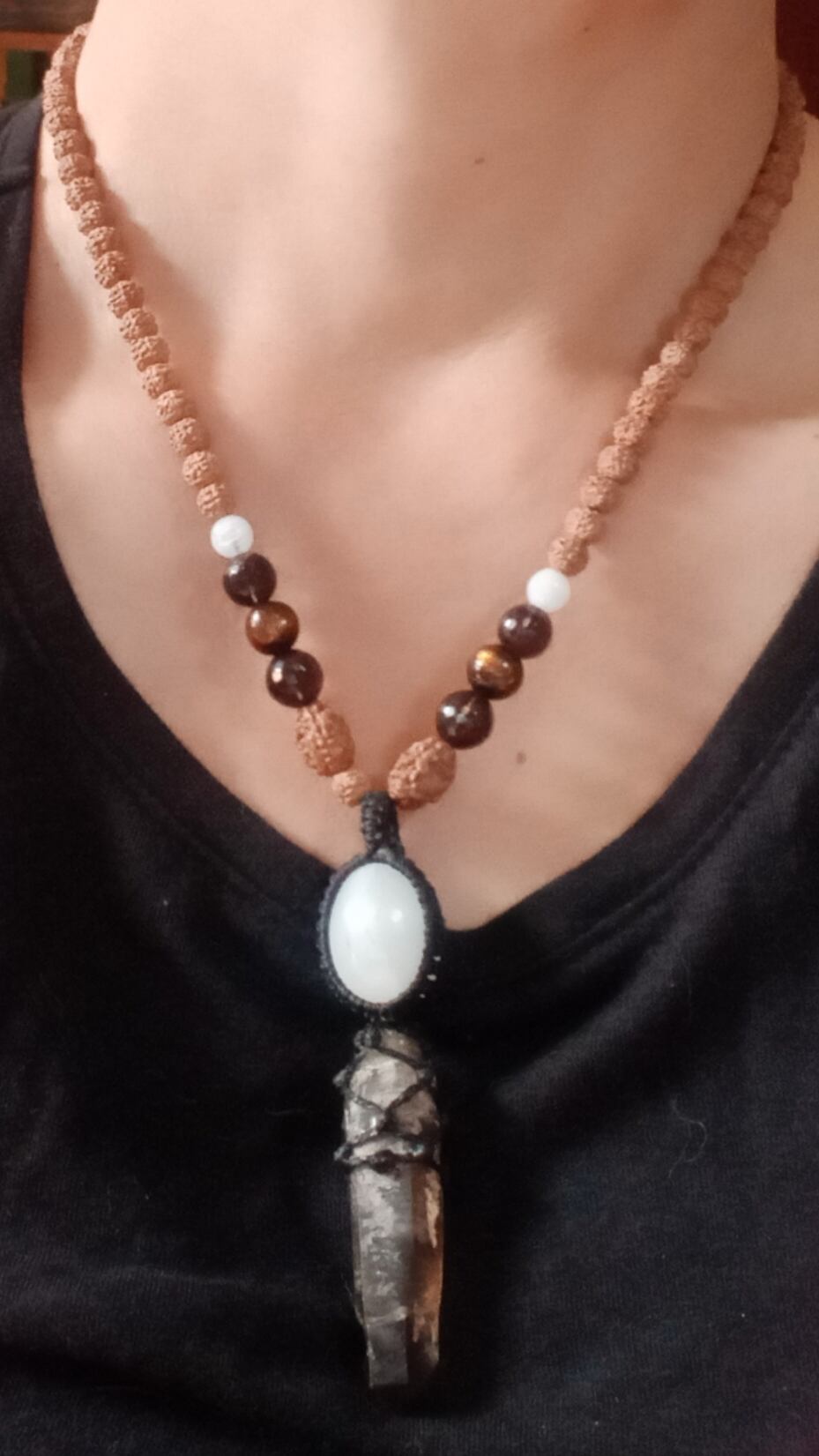 ★ルドラクシャ5面(約5,5mm)・ルドラクシャ3面(約縦10mm)・カッティングスモーキークォーツ(約7mm)・ゴールドウリ(約8mm)・ムーンストーン(約5,5mm)・ケオンカボション(約23mm)・スモーキークォーツ(約縦47mm)