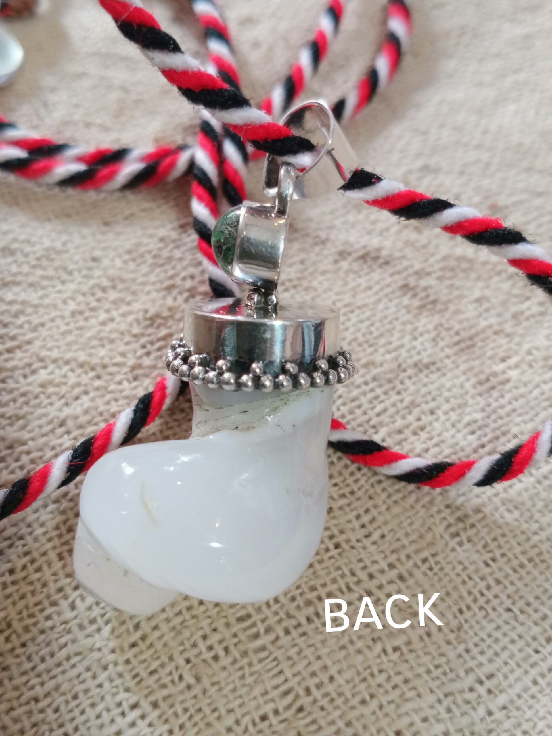 「帽子をかぶったケオン」の新シリーズの1つで、バリヒンドゥーでは、ヒンドゥー三大神をあらわす「赤白黒」の3色のミサンガをネックレスにしてみました。(^^)