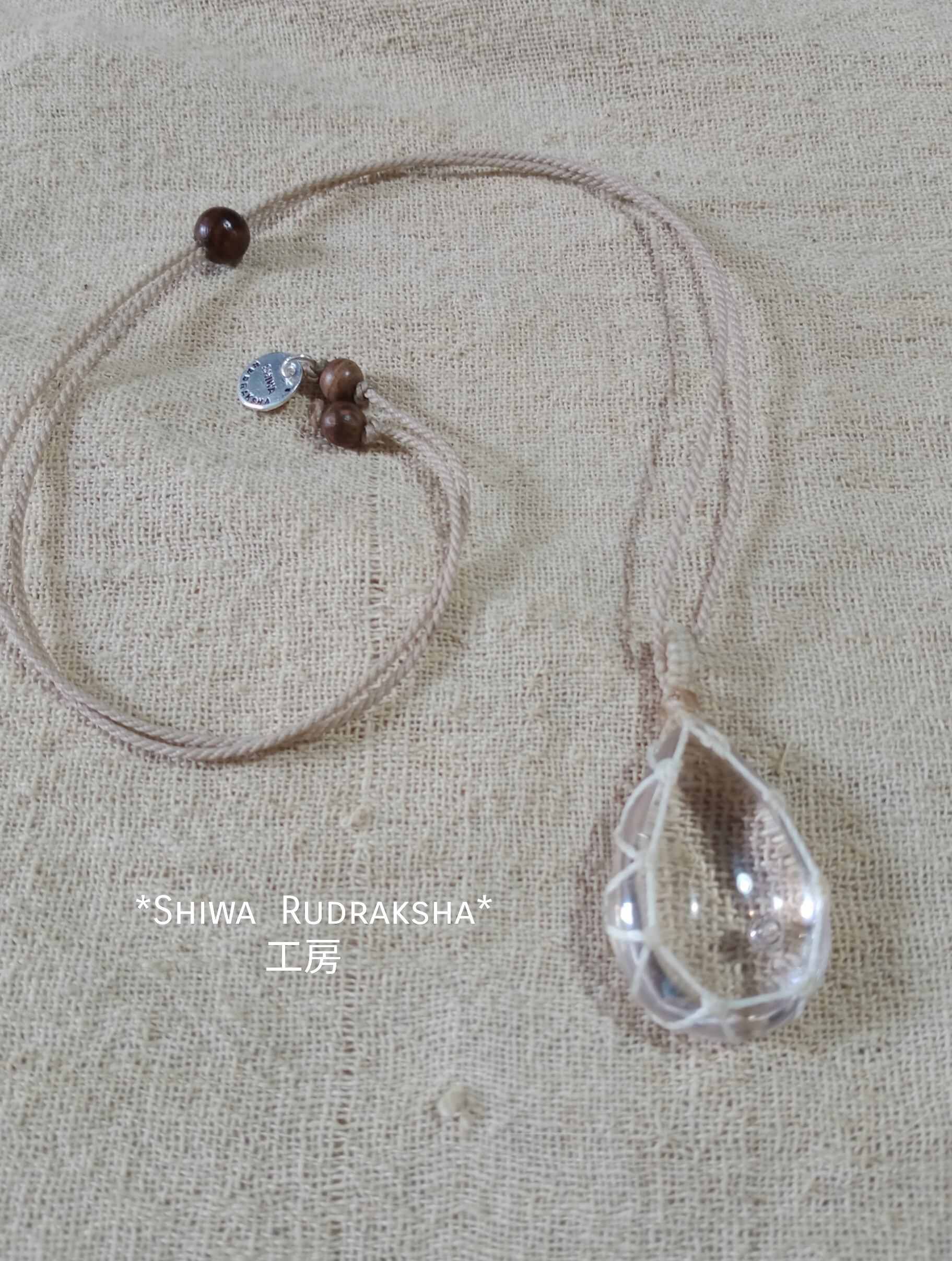 「アンダラクリスタル・インドネシア産」のクリアアクアカラーの原石をドロップ型のカボションに研磨して製作したマクラメ加工の紐ネックレスです。