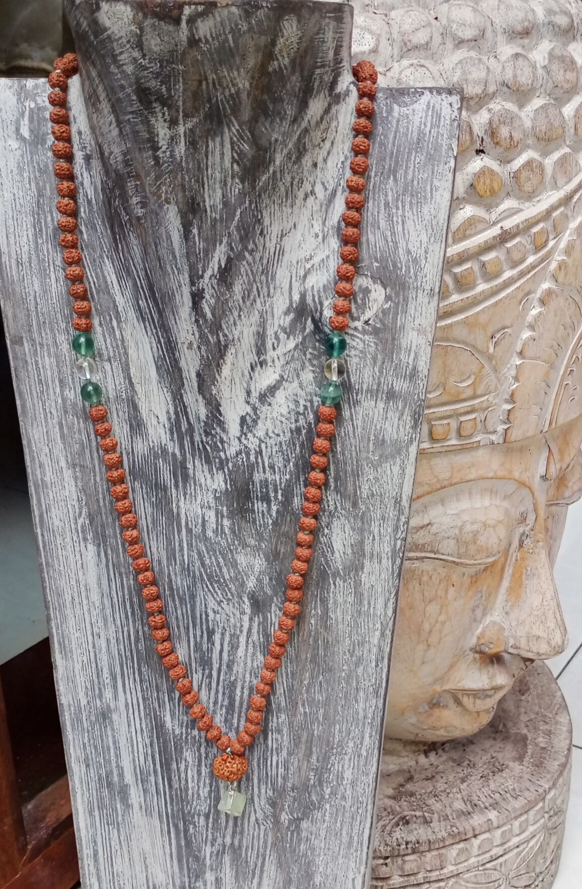 グルビーズ「7面ルドラクシャ(ラクシュミー)」と、シルバー加工したフローライトをペンダントトップにした108粒マーラーネックレスです。