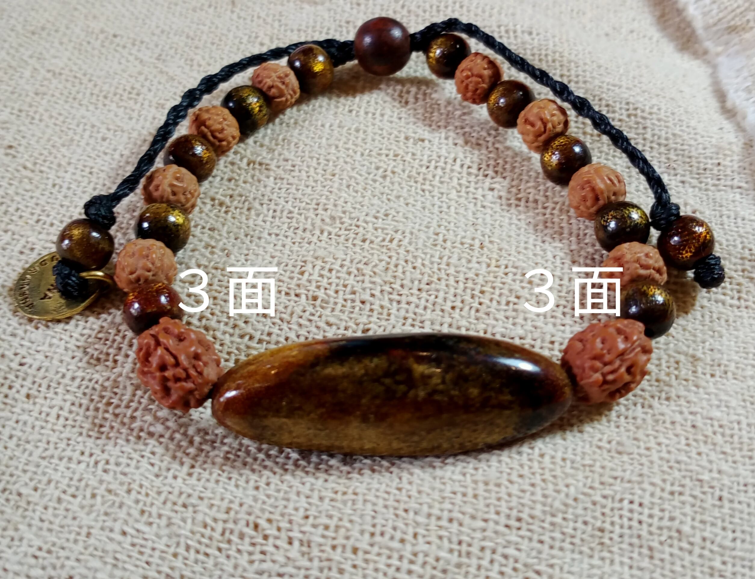 ロンデルの横には、ヒンドゥー三大神が内在すると言われる「3面(アグニ)」ルドラクシャを組み入れ、それ以外は高品質ルドラクシャ「キスワント5面」と「ゴールド・ウリ」を交互にしています。