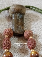 「グリーンウリヌサ・インドネシア産」のミニサイズの根っこの部分をペンダントトップにして、「ルドラクシャ」と「ゴールドウリ」を組み入れた紐ネックレスです。