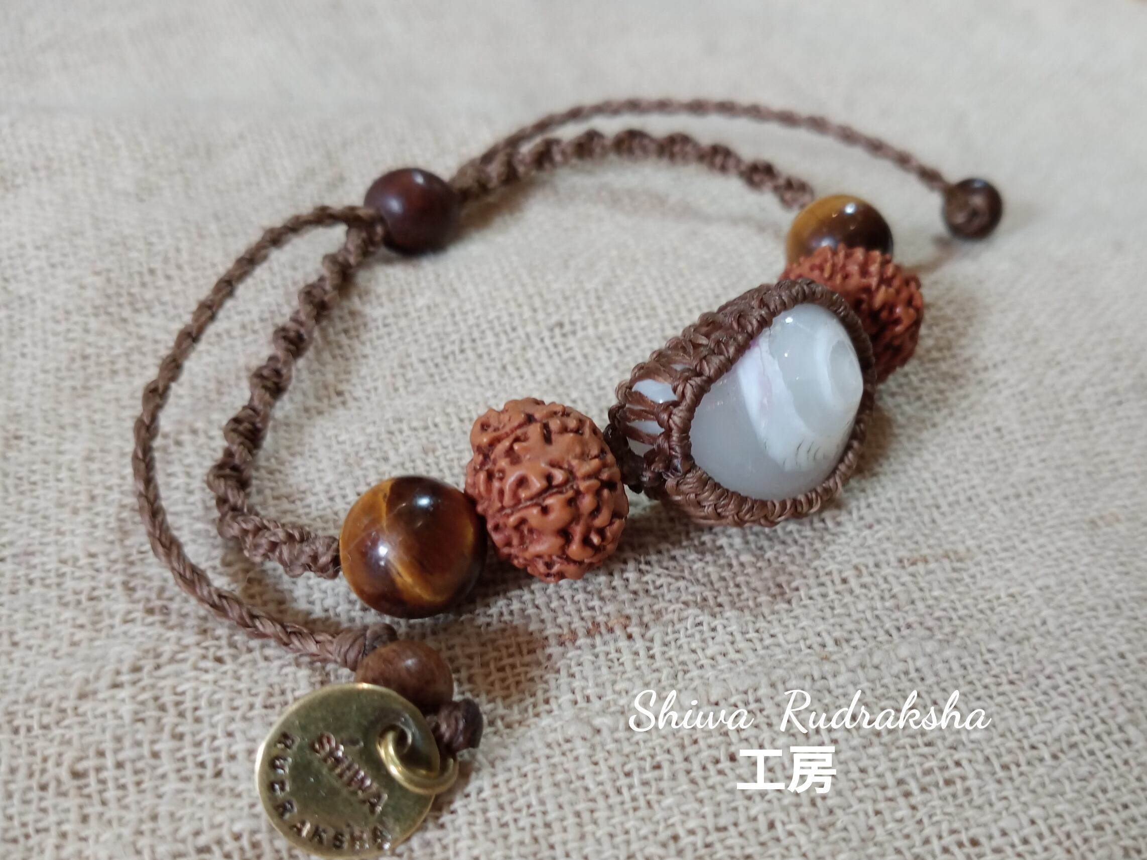 「ケオン」の渦巻部分と、パワーストーン『タイガーアイ』を使用した調整可能なマクラメ加工紐ネックレスです。