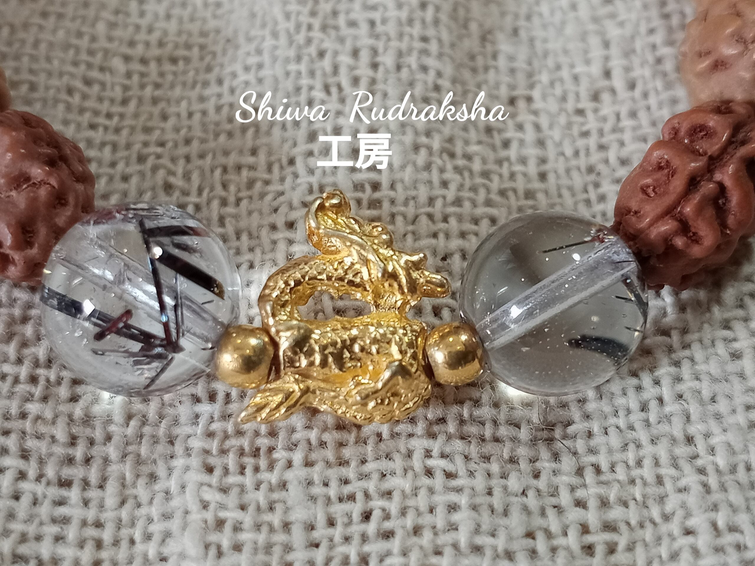 ★キスワントルドラクシャ5面(約7mm)・ルドラクシャ2面(約9mm)・ルドラクシャ3面(約10mm)・ブラックルチルクウォーツ(約8mm)・ドラゴン(約10mm:24Kゴールドコーティング925シルバー)
