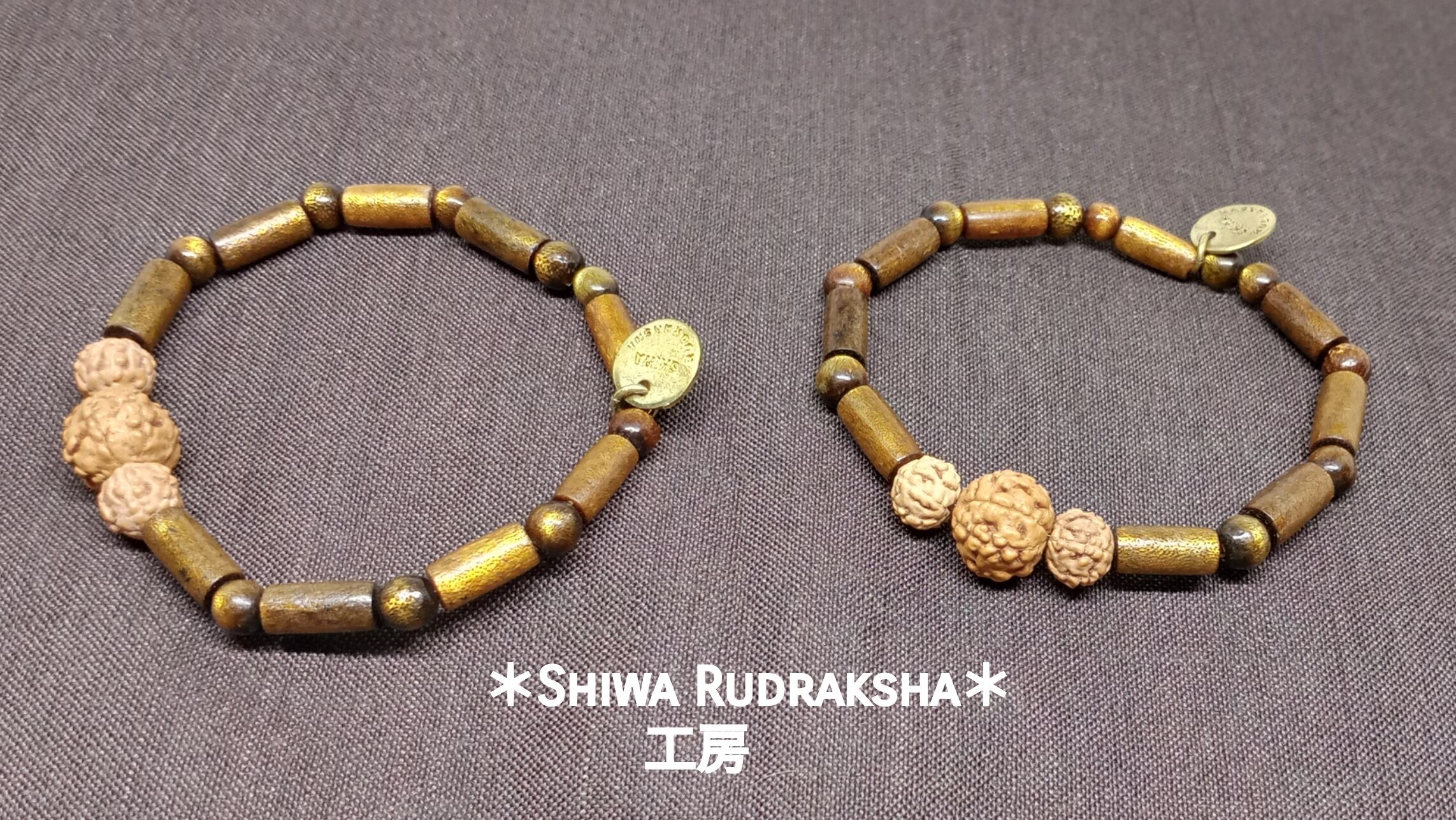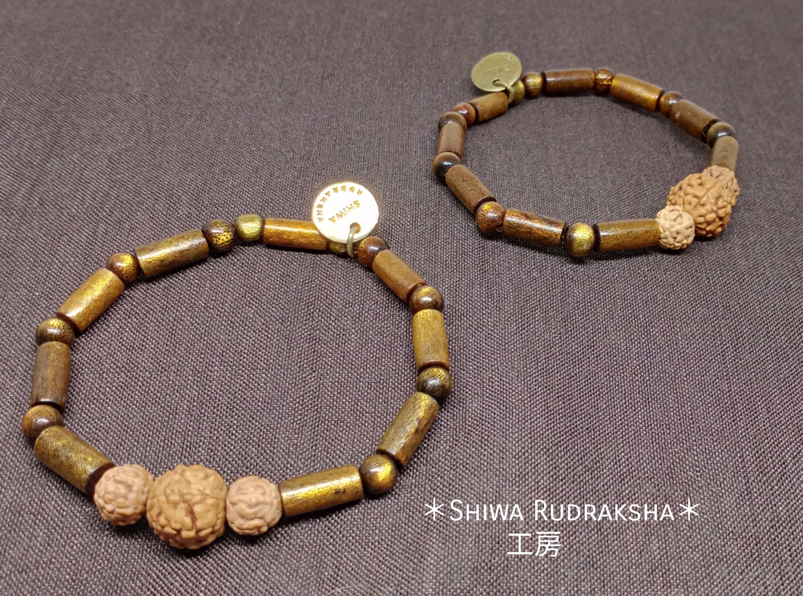 「ゴールド・ウリ」の、ラウンドビーズと円柱型のビーズに、「幸福と繫栄」の7面ルドラクシャ(ラクシュミー)を5面ルドラクシャで挟んだブレスレットです。