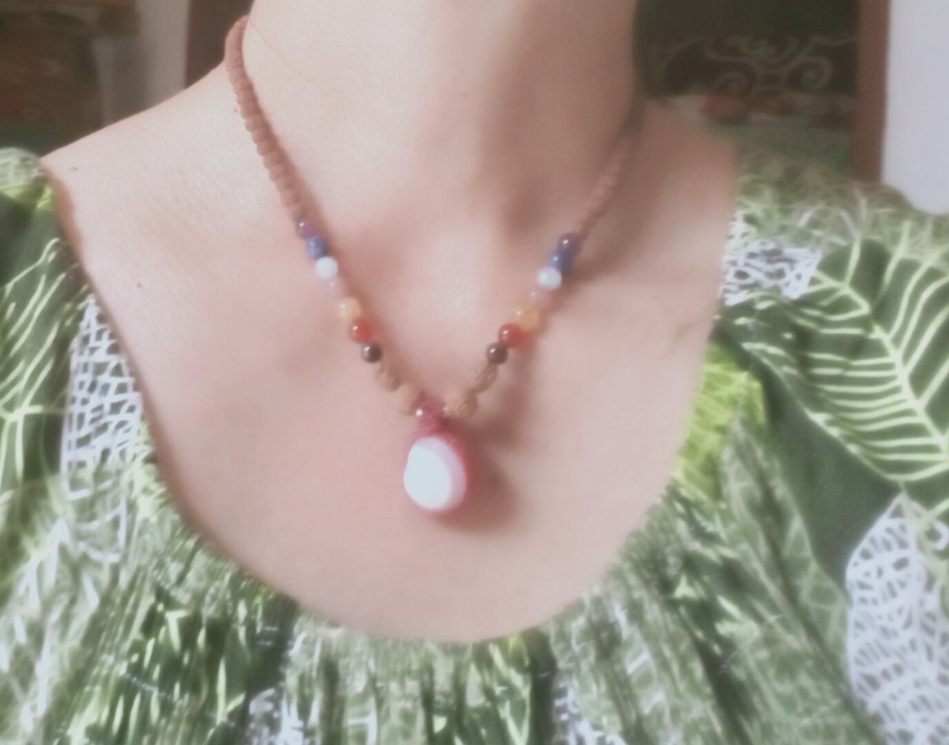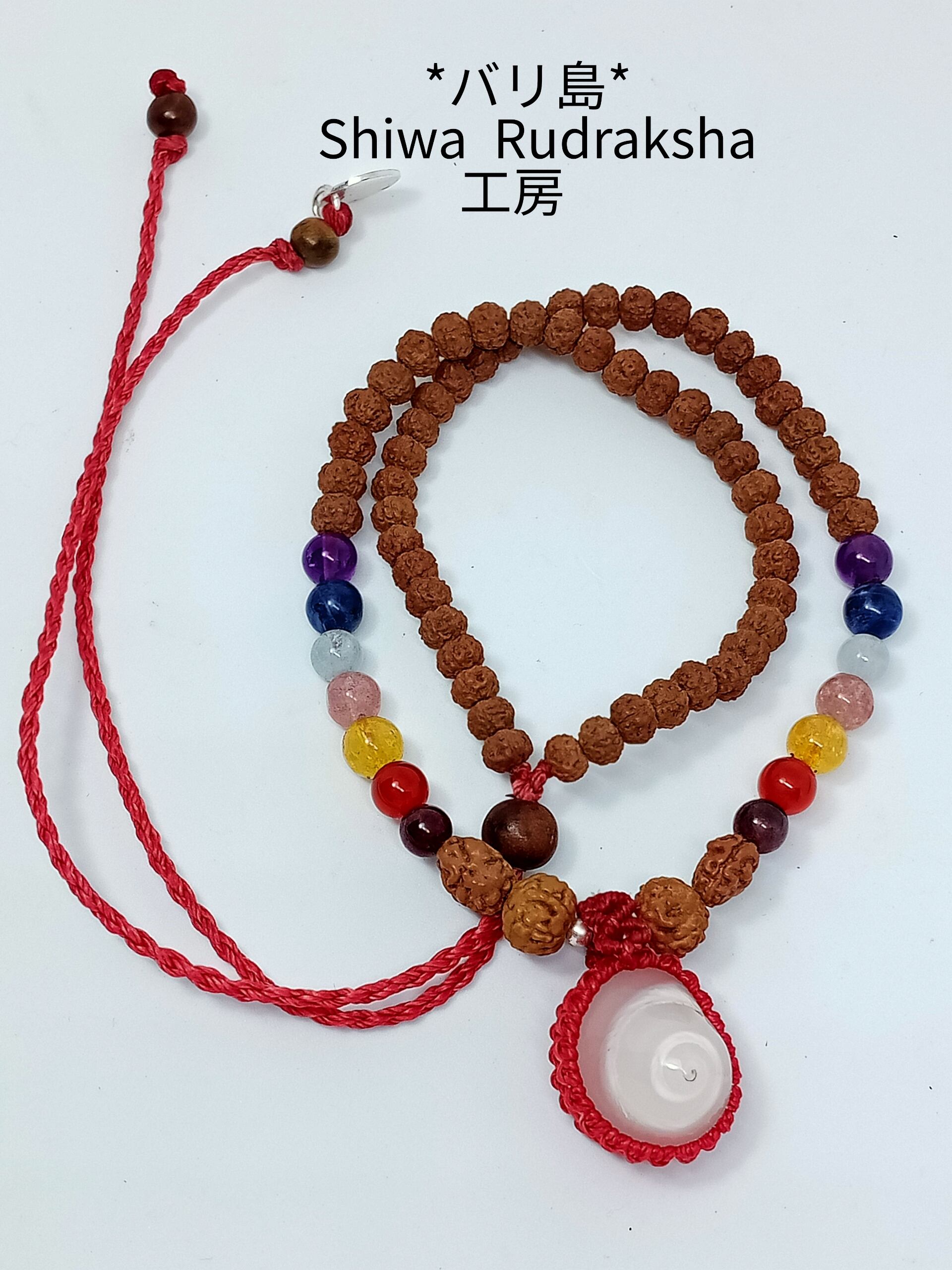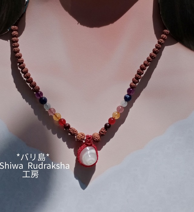 「ケオン」の渦巻部分をマクラメ加工した、7色のチャクラカラーとルドラクシャの調整可能な紐ネックレスです。