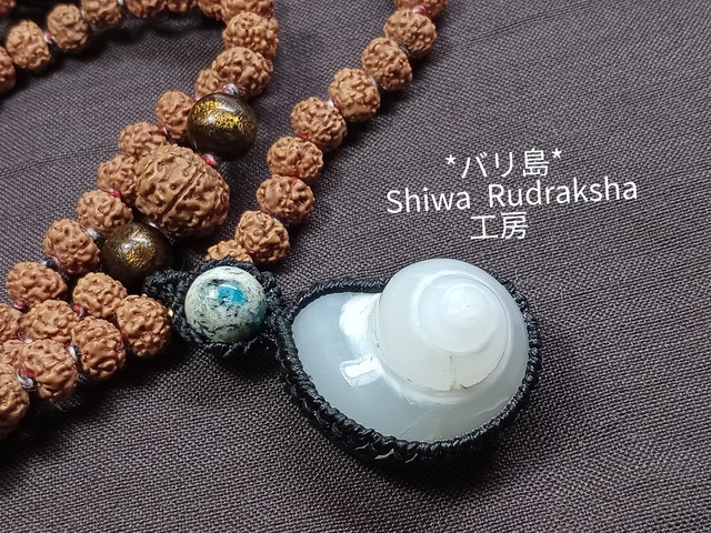 ルドラクシャは、「7面ルドラクシャ(ラクシュミー女神)」と「8面ルドラクシャ(ガネーシャ)」をマーラー(数珠)部分の中央部に組み入れ「ゴールドウリ」で挟みました。