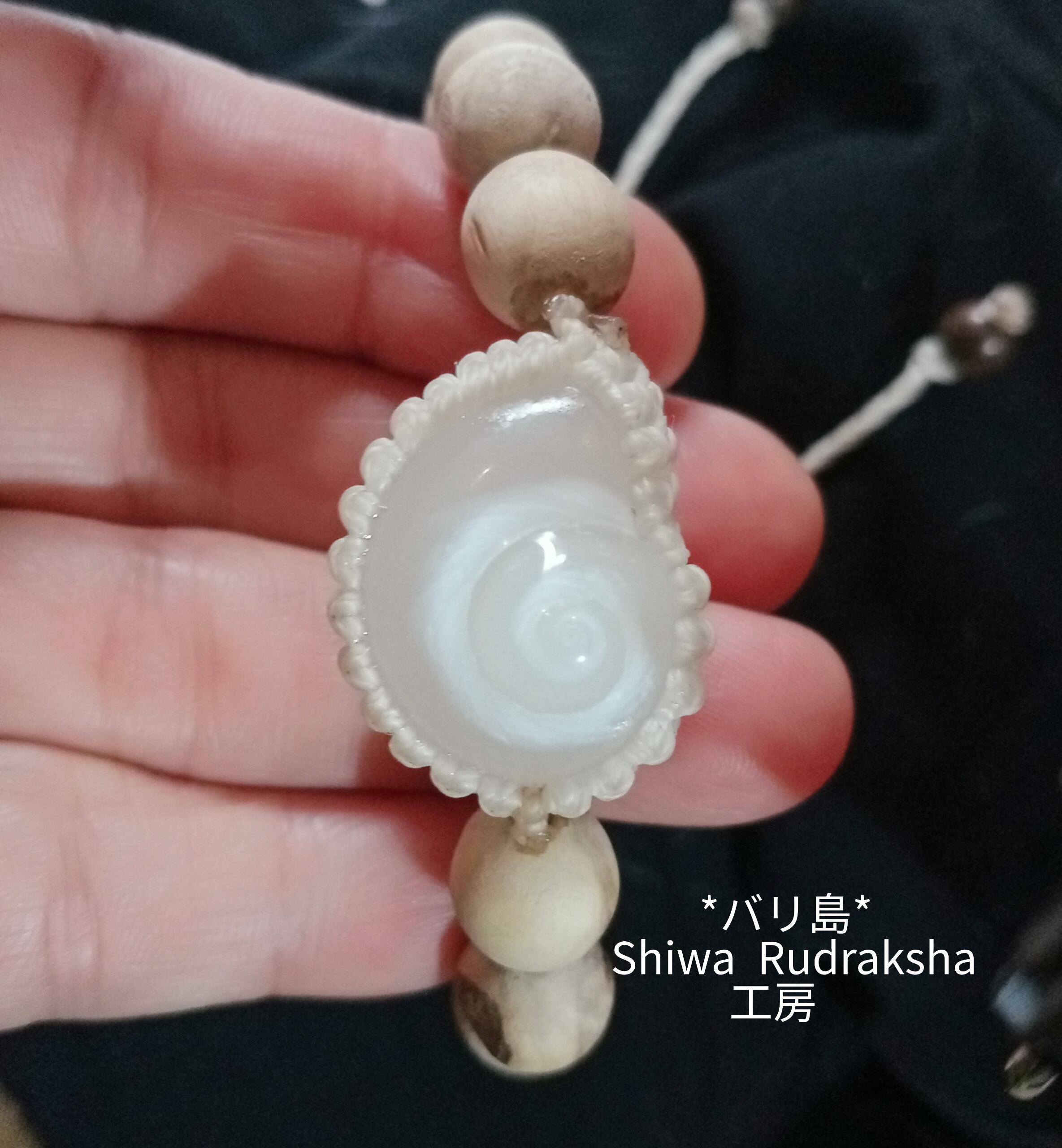 『ケオン』の渦巻き部分をマクラメ加工して、インド産トゥルシービーズで紐ブレスレットを製作しました。
