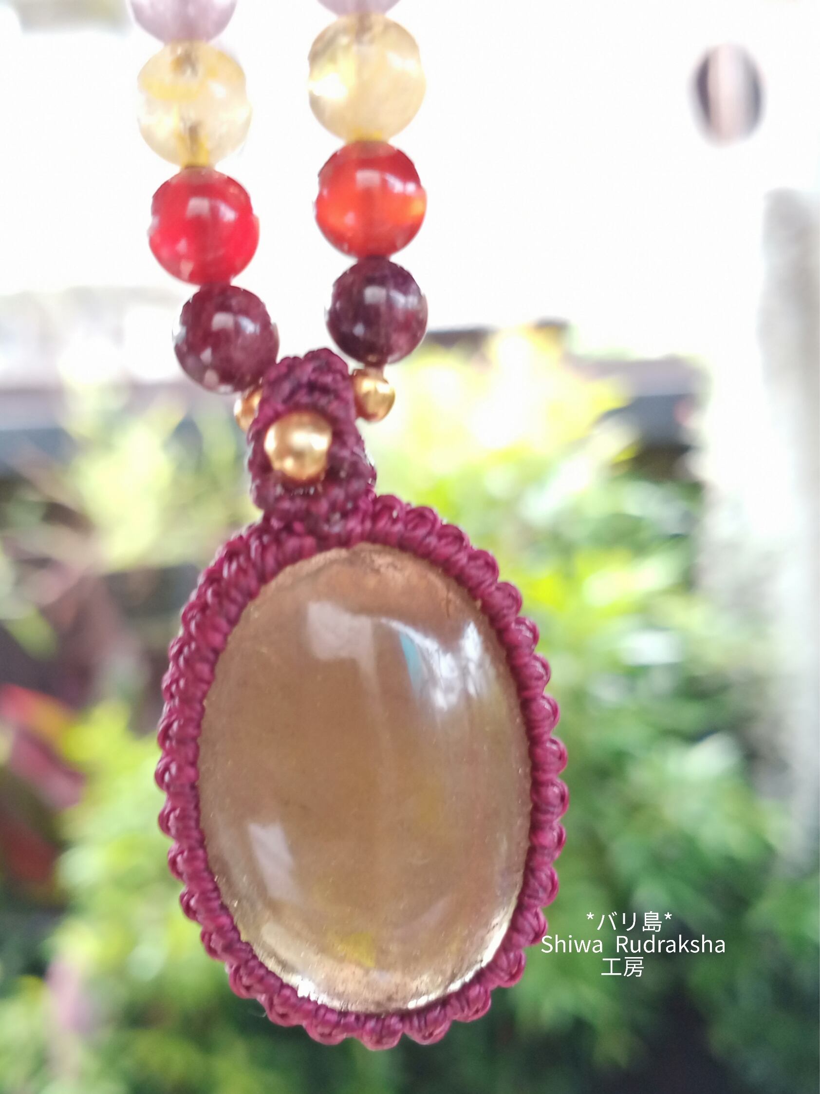 蜂蜜のような色をしたインドネシア産『クチュブンアイル(アメジスト)』をメインにしたマクラメ組紐ネックレスです。