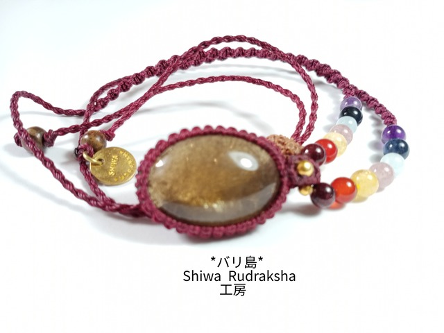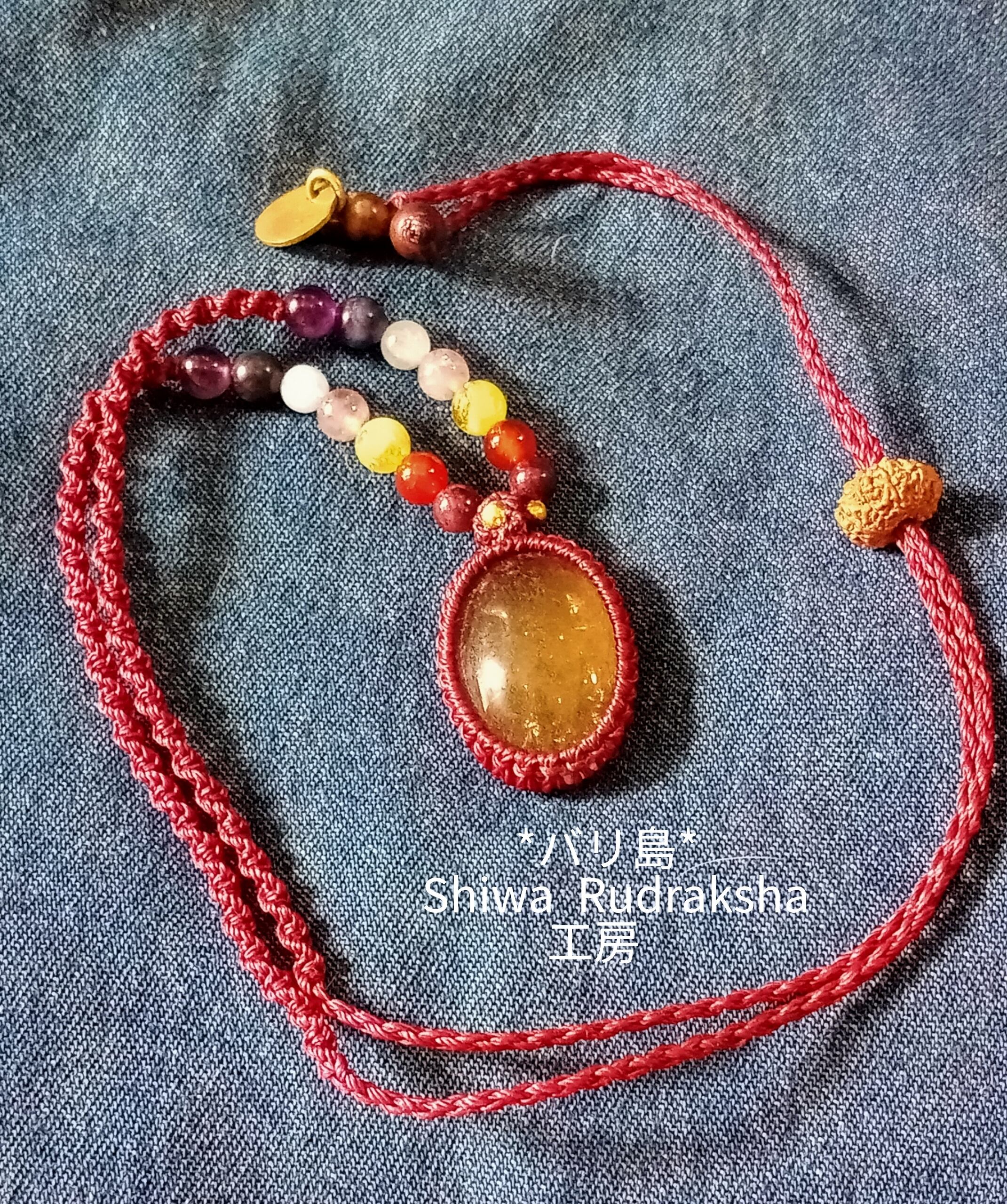 心が元気になるようなチャクラカラーのパワーストーンを組み入れて、ルドラクシャはネックレスの長さを調整するストッパー部分に「ルドラクシャ8面ガネーシャ」を使用しました。