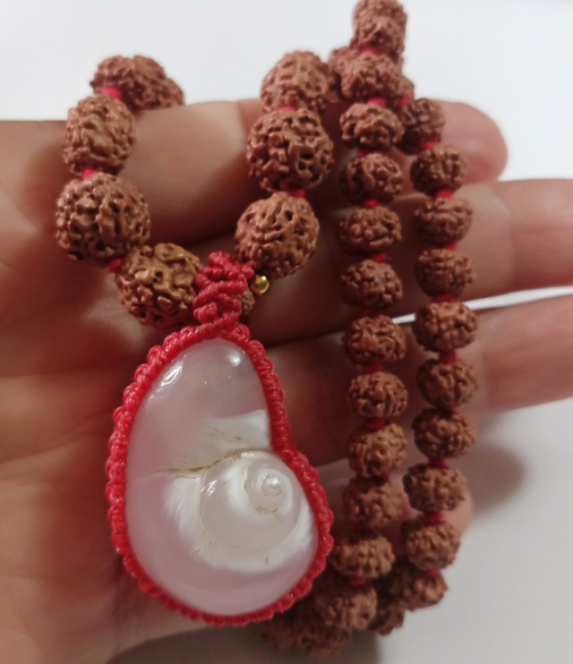 「ケオン」の渦巻部分をマクラメ加工にし、ペンダントトップにした108粒マーラーです。