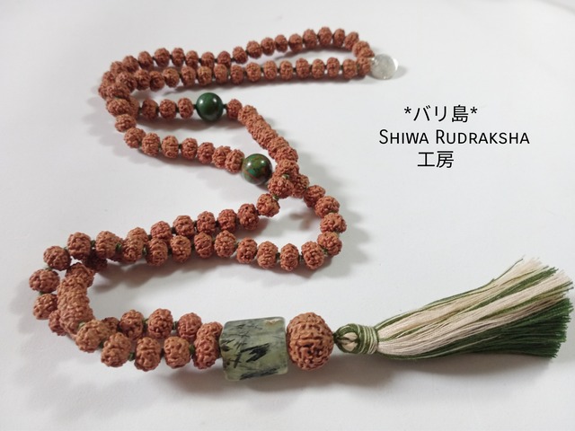 スクエアの「プレナイト」のパワーストーンと、ルドラクシャ『8面ガネーシャ』をグルビーズにした108粒デザインマーラーです。