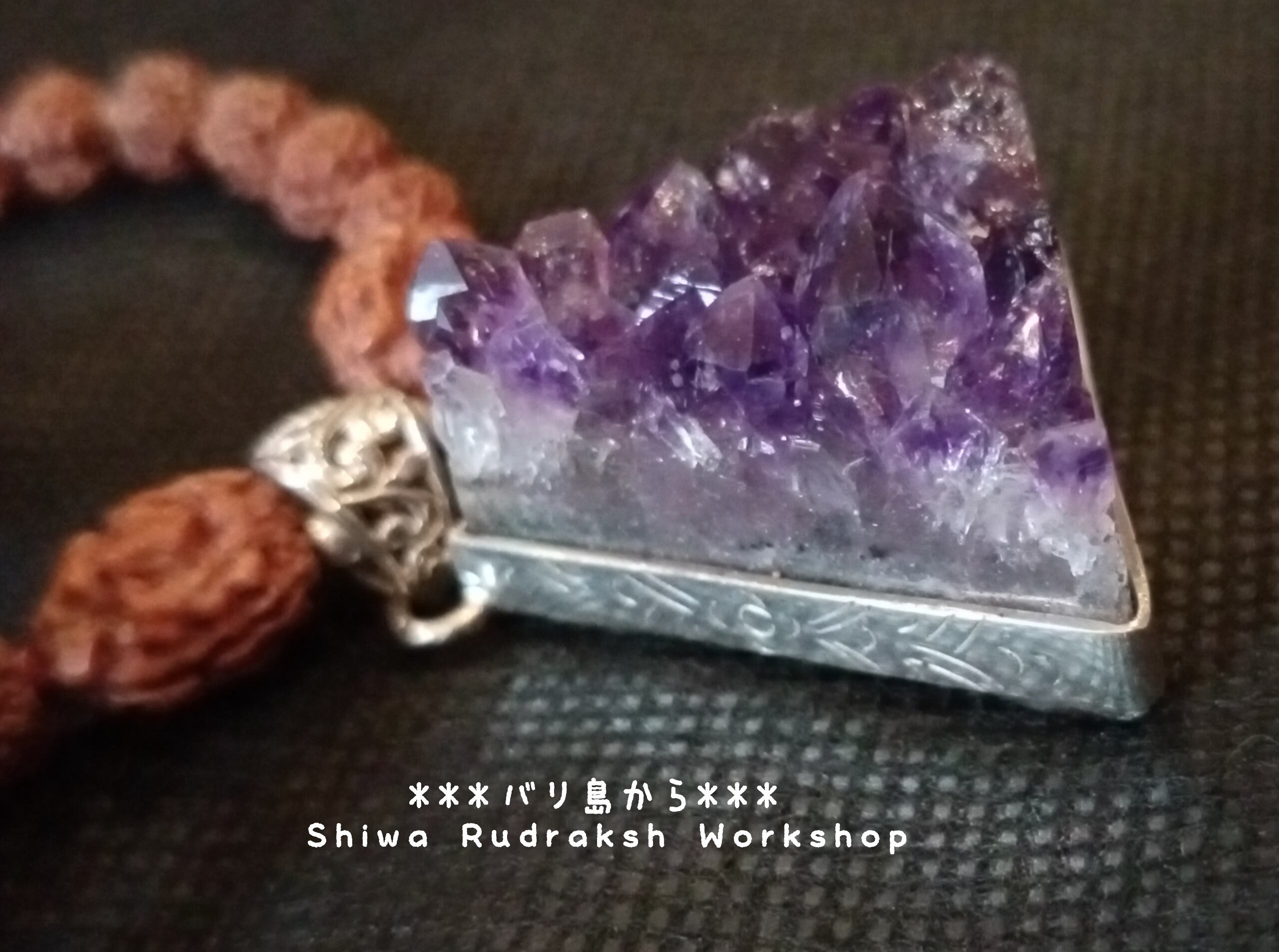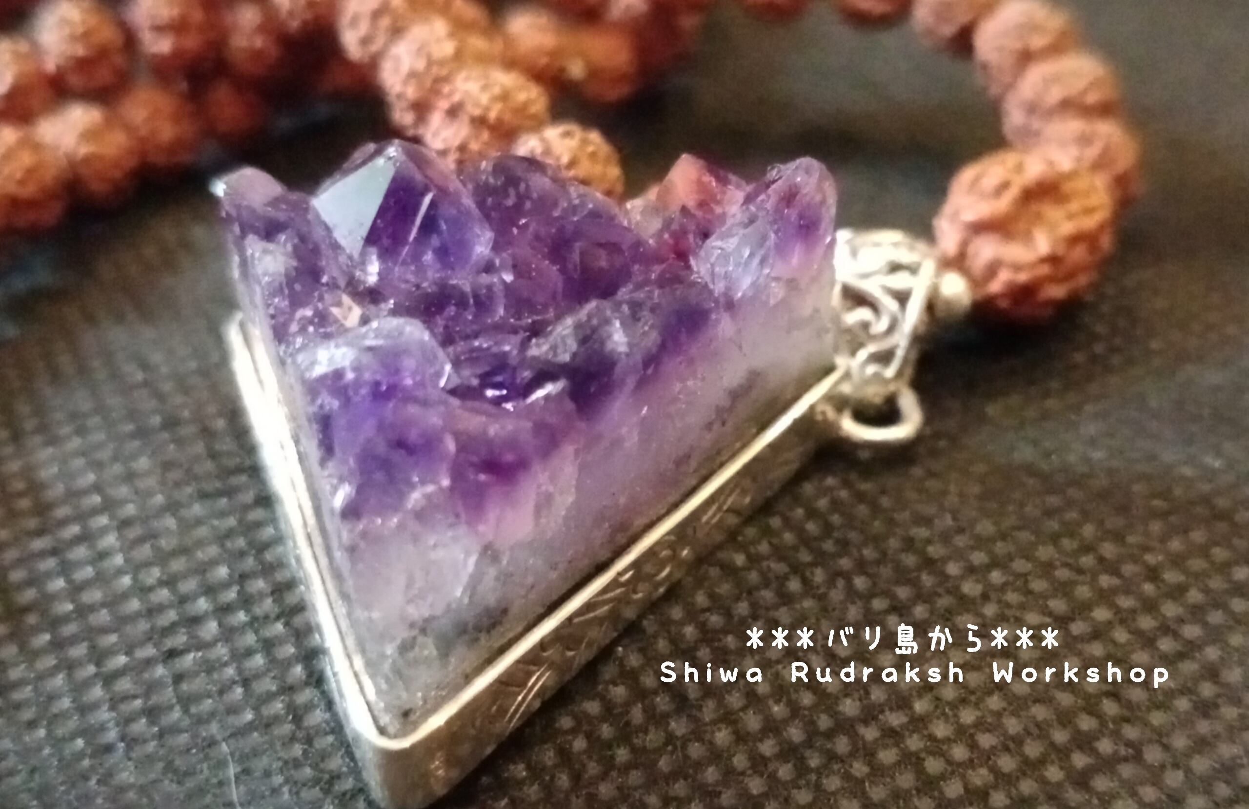 原石から買い付けた『アメジストクラスター』をトライアングル(三角)にカットして、「ヒンドゥー三大神が内在すると言われる」ルドラクシャ「3面アグニ」を左右に組み入れた108粒マーラーです。