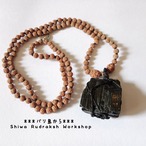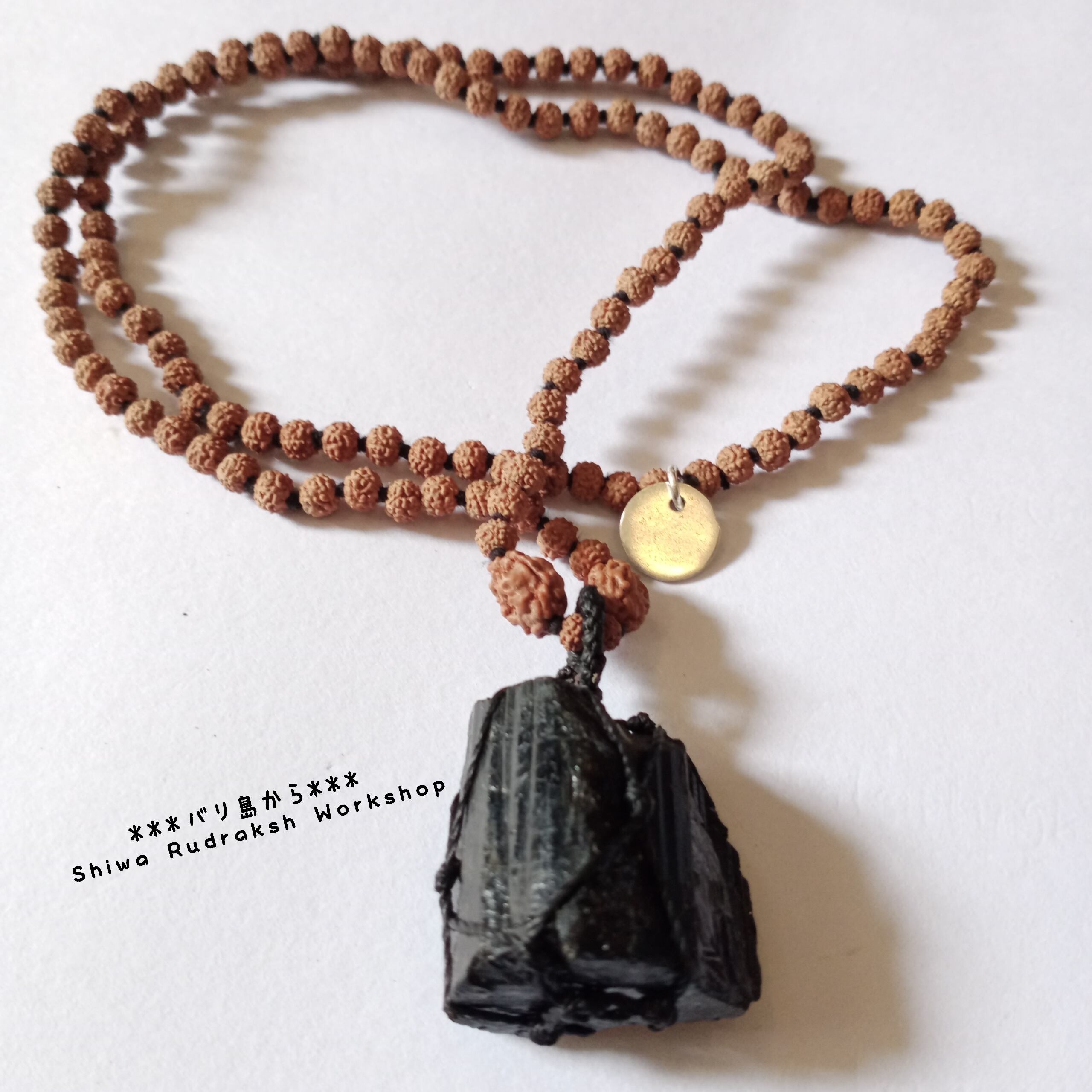 使用したルドラクシャは、「ブラックトルマリン」の両脇に「ヒンドゥー三大神」が内在すると言われる「ルドラクシャ3面(アグニ神)」を組み入れ、市場では通常のルドラクシャより約2,5倍以上で取引されるインドネシア特有の小粒ルドラクシャ5面を使用しています。