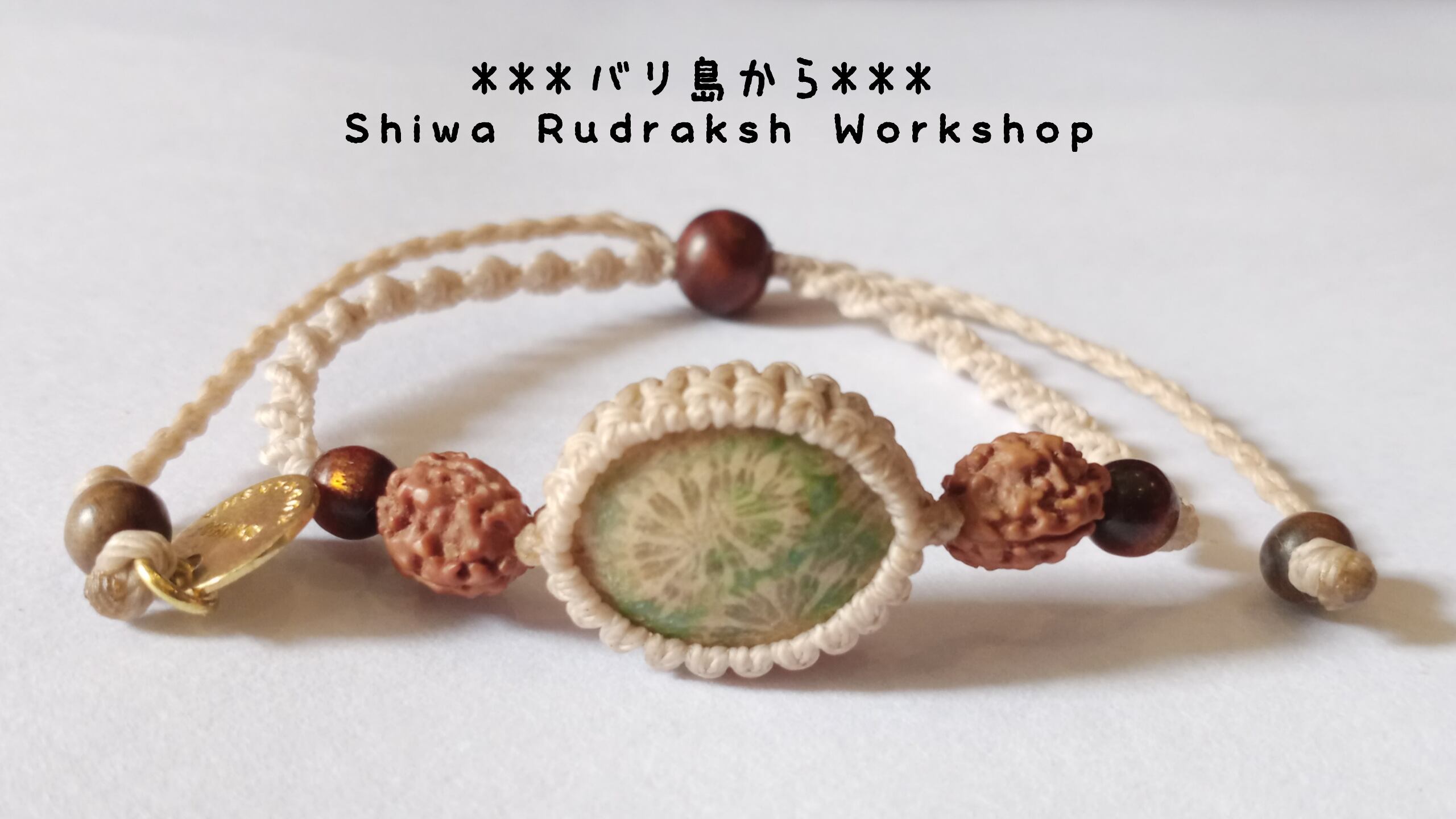 「フォシルコーラル(珊瑚の化石)」をマクラメ加工した、「ゴールドウリ」とルドラクシャの紐ブレスレットです。