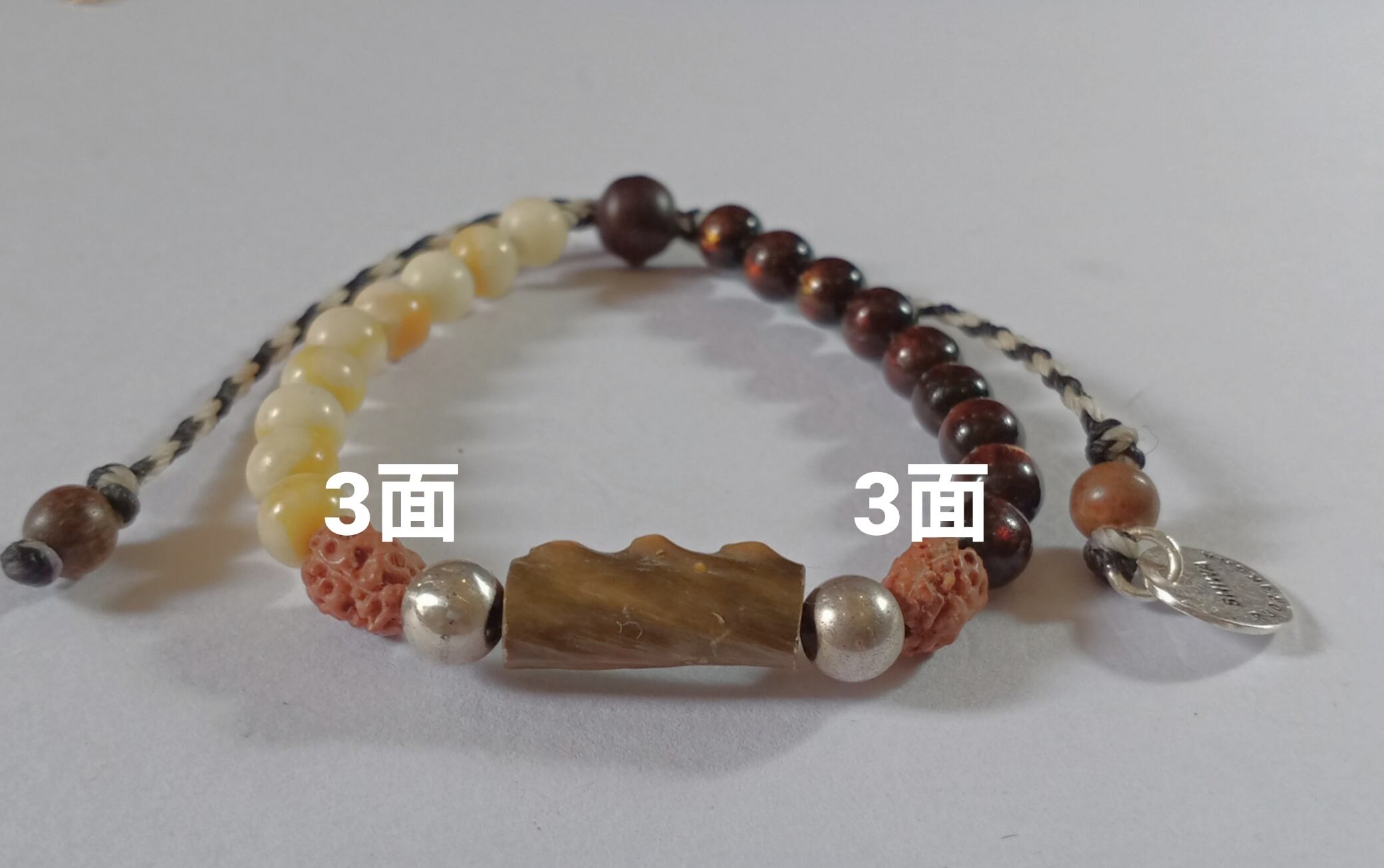 「グリーンウリ・インドネシア産」の幹部分をメインにした、ルドラクシャの紐ブレスレットです。