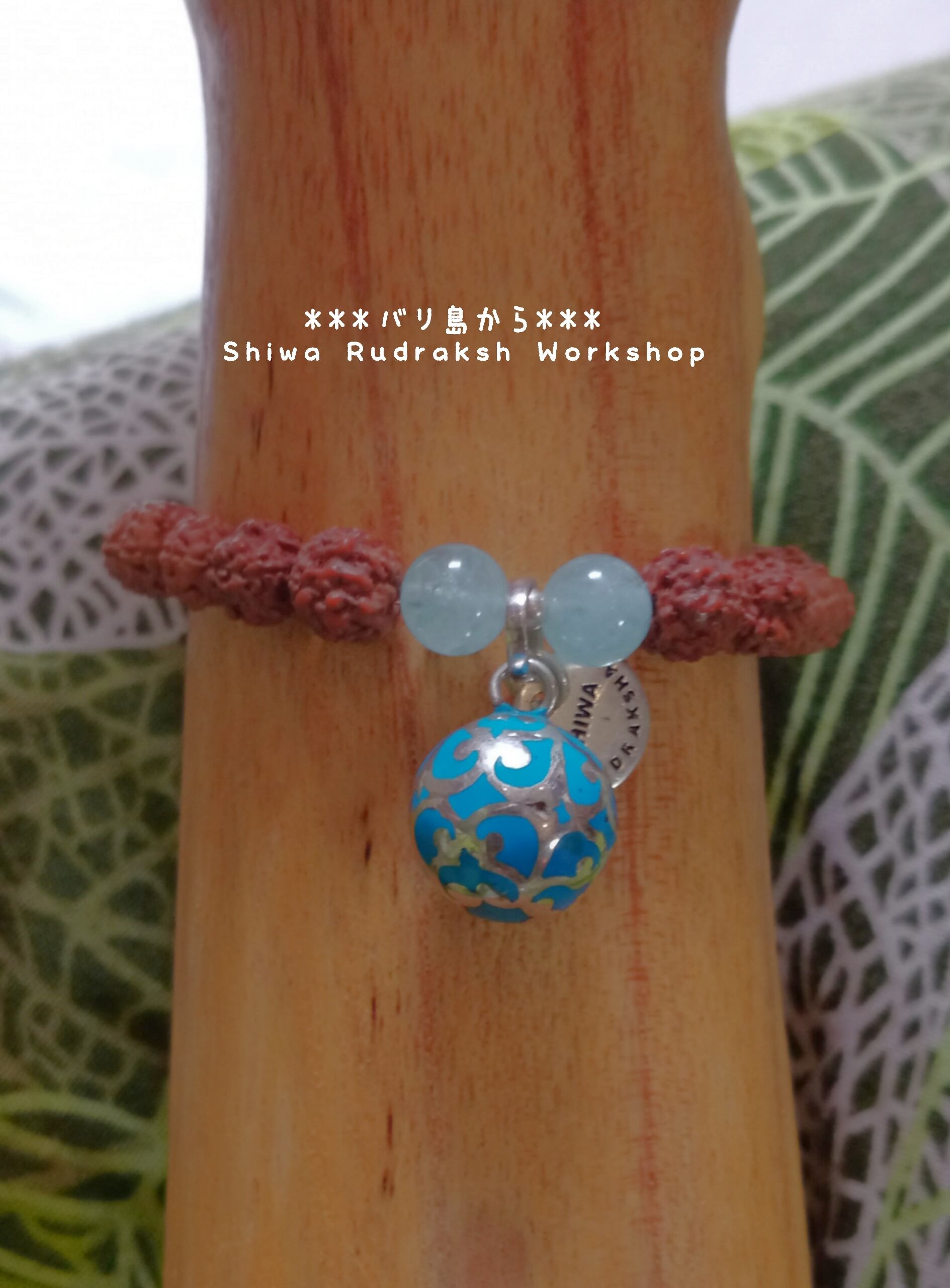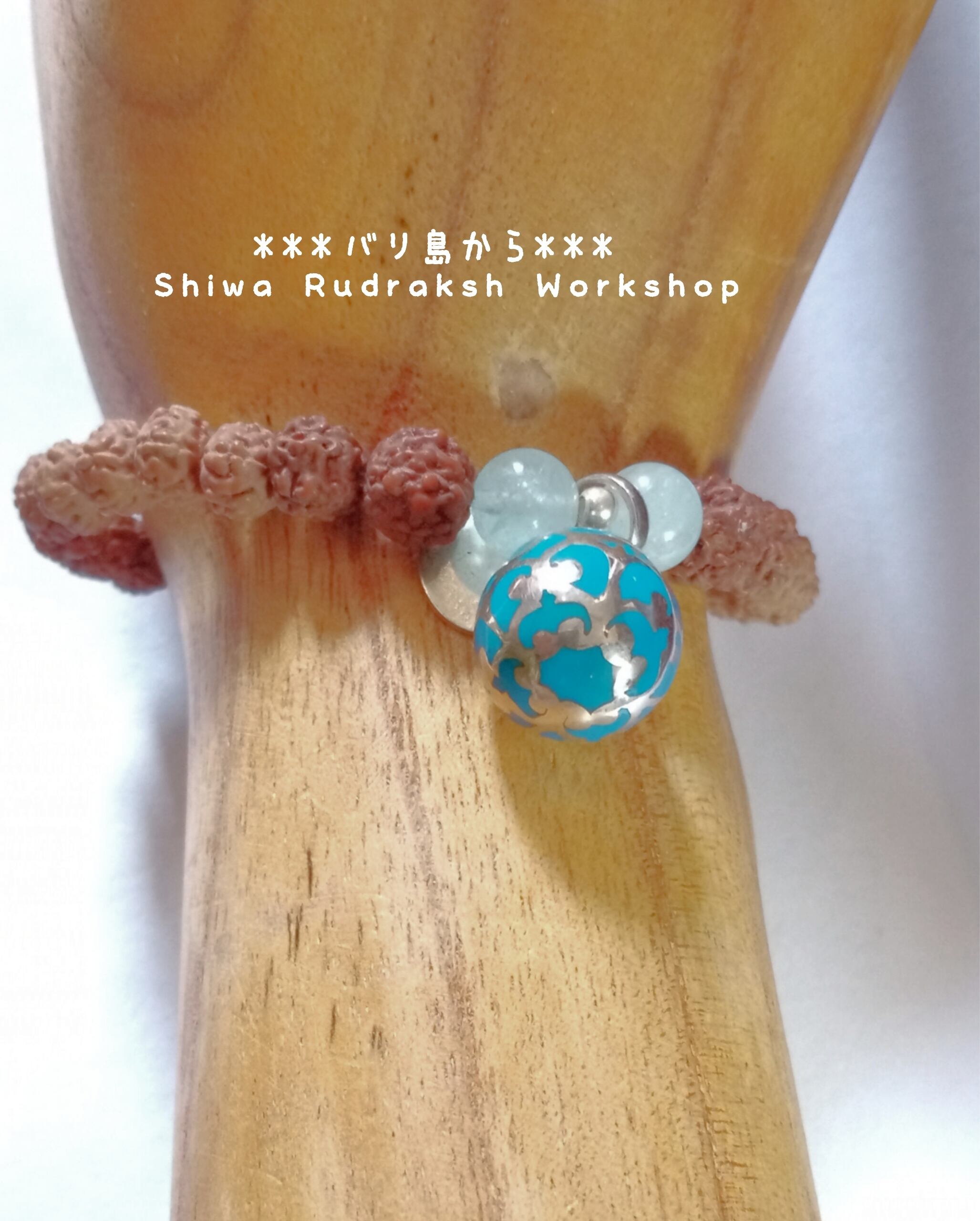 ★キスワントルドラクシャ5面(約6mm)・ルドラクシャ4面(縦7mm)・ルドラクシャ6面(約7,5mm)・アクアマリン(約7mm)・アラベスクガムランボール(約15mm:シルバー925)
