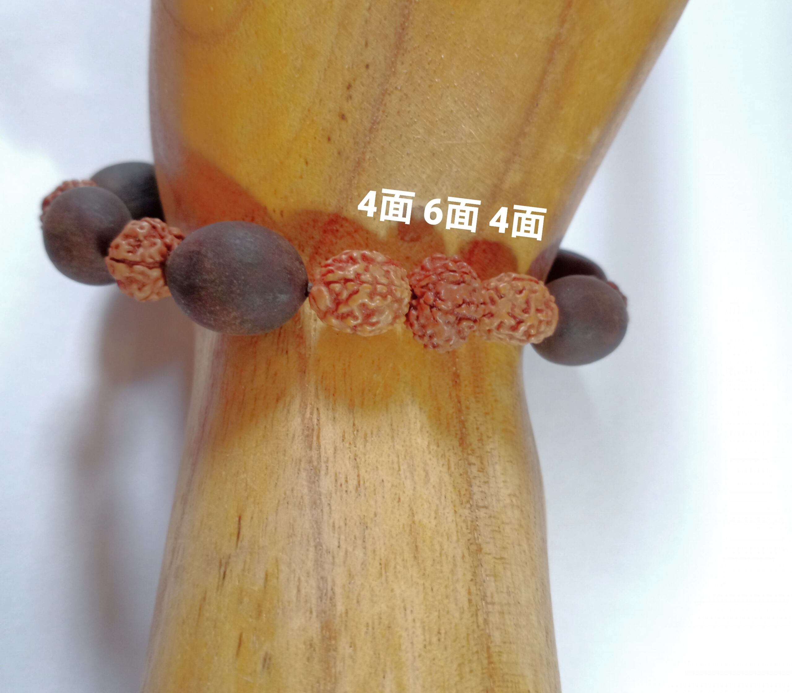 【ロータスシード】蓮の実とルドラクシャ5面をベースに使用して、サラスヴァテ女神をあらわす「4面&6面ルドラクシャ」を真ん中に組み入れています。