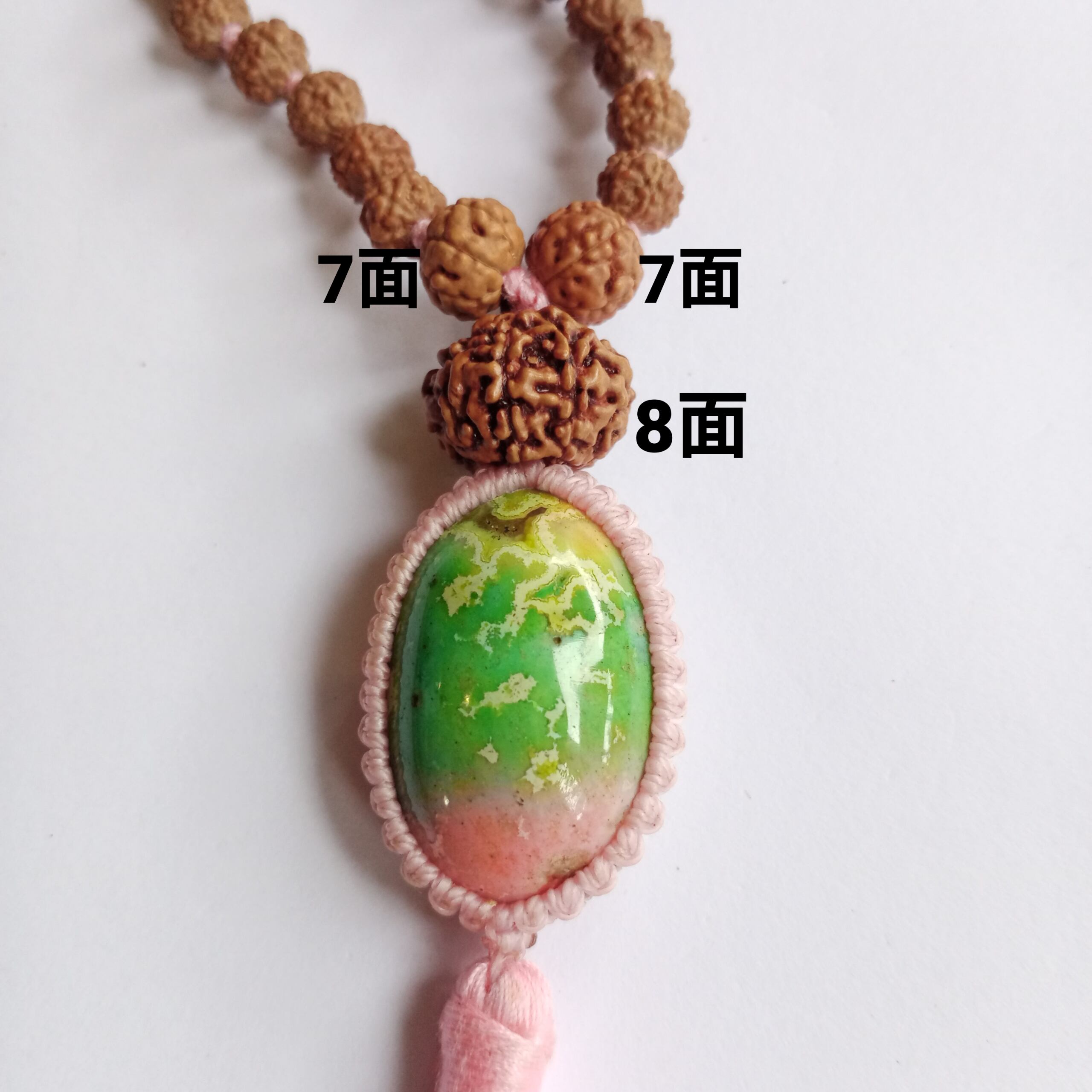 インドネシア産「パンチャワルナ」と呼ばれるストーンをマクラメ加工した108粒ルドラクシャマーラーです。