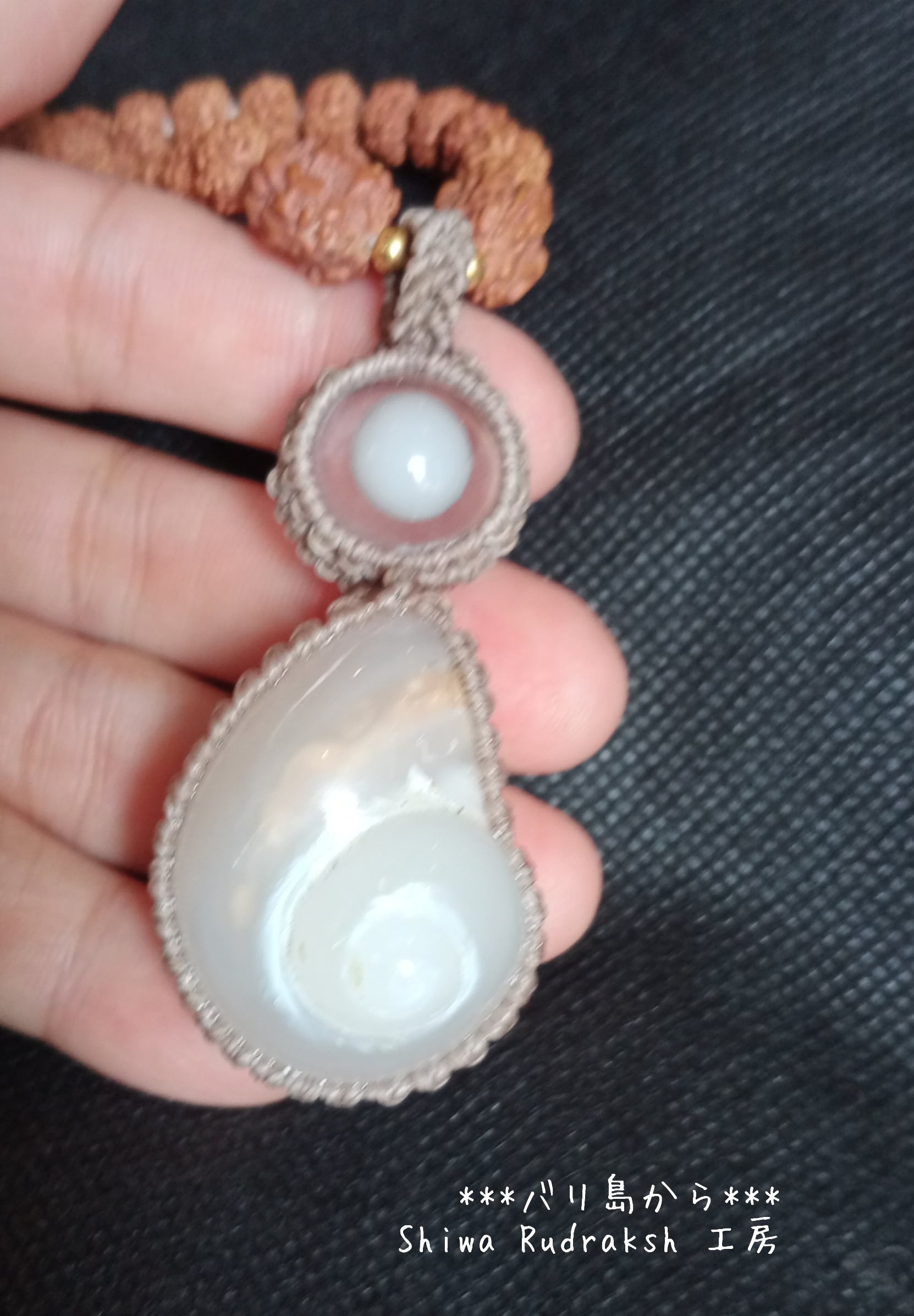 ペンダントトップの左右に「ヒンドゥー三大神が内在すると言われる「3面(アグニ神)」を組み入れ、後は小粒ルドラクシャ5面です。