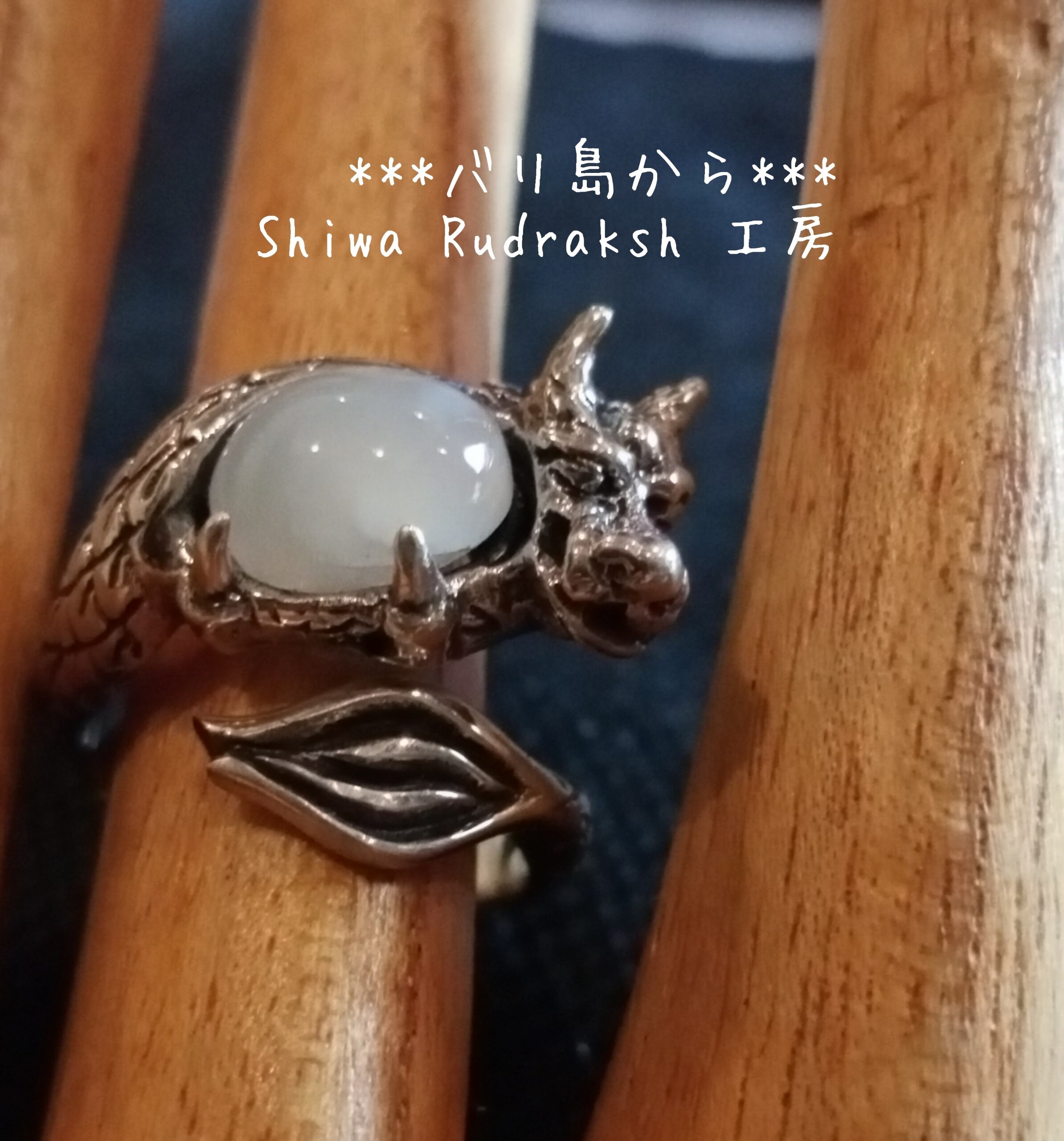 「ケオン」の茎部分をカボションにして、龍神のモチーフにしました。