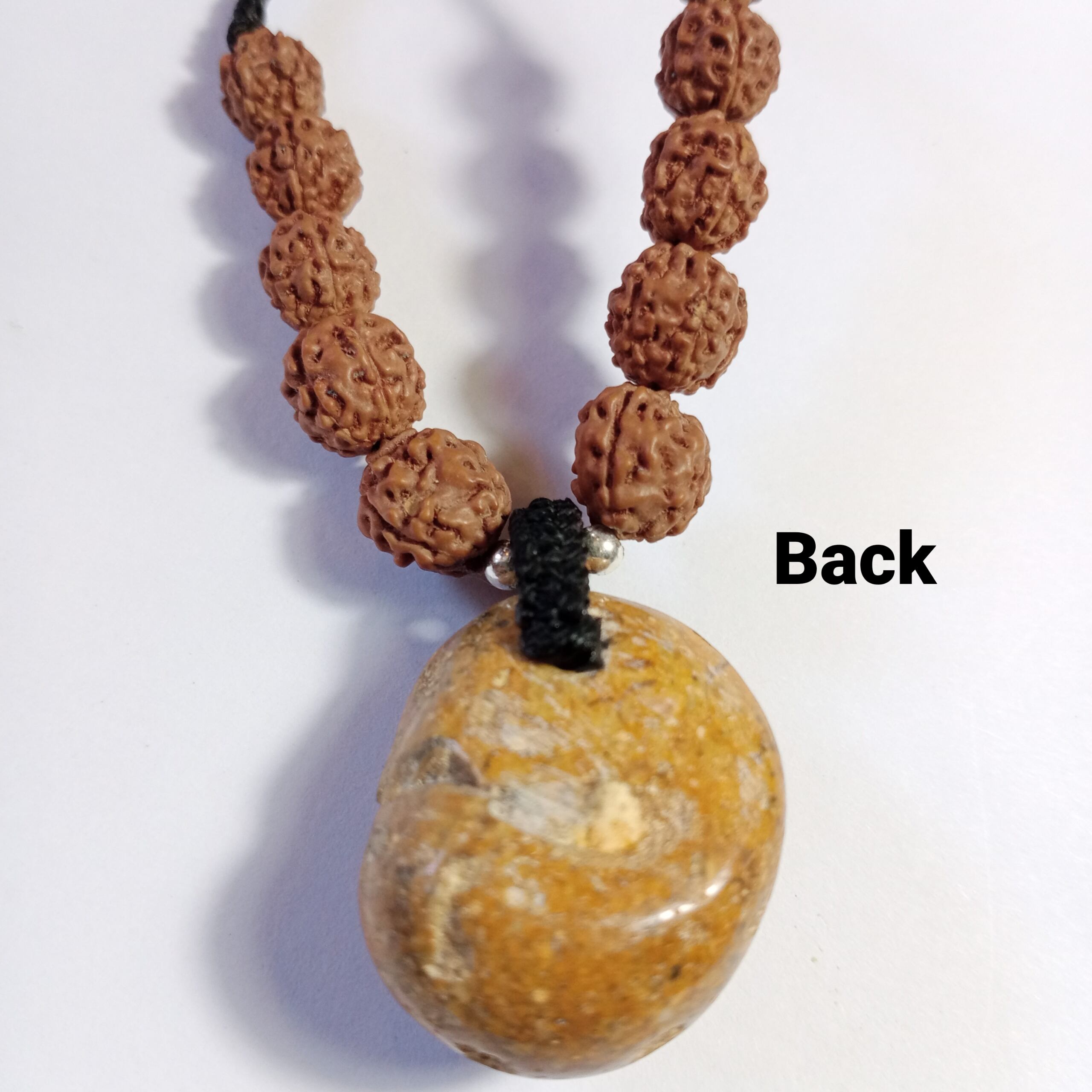 ルドラクシャは、三大神が内在すると言われる「3面(アグニ)」を加え、少し大きめのルドラクシャ5面で挟みました。