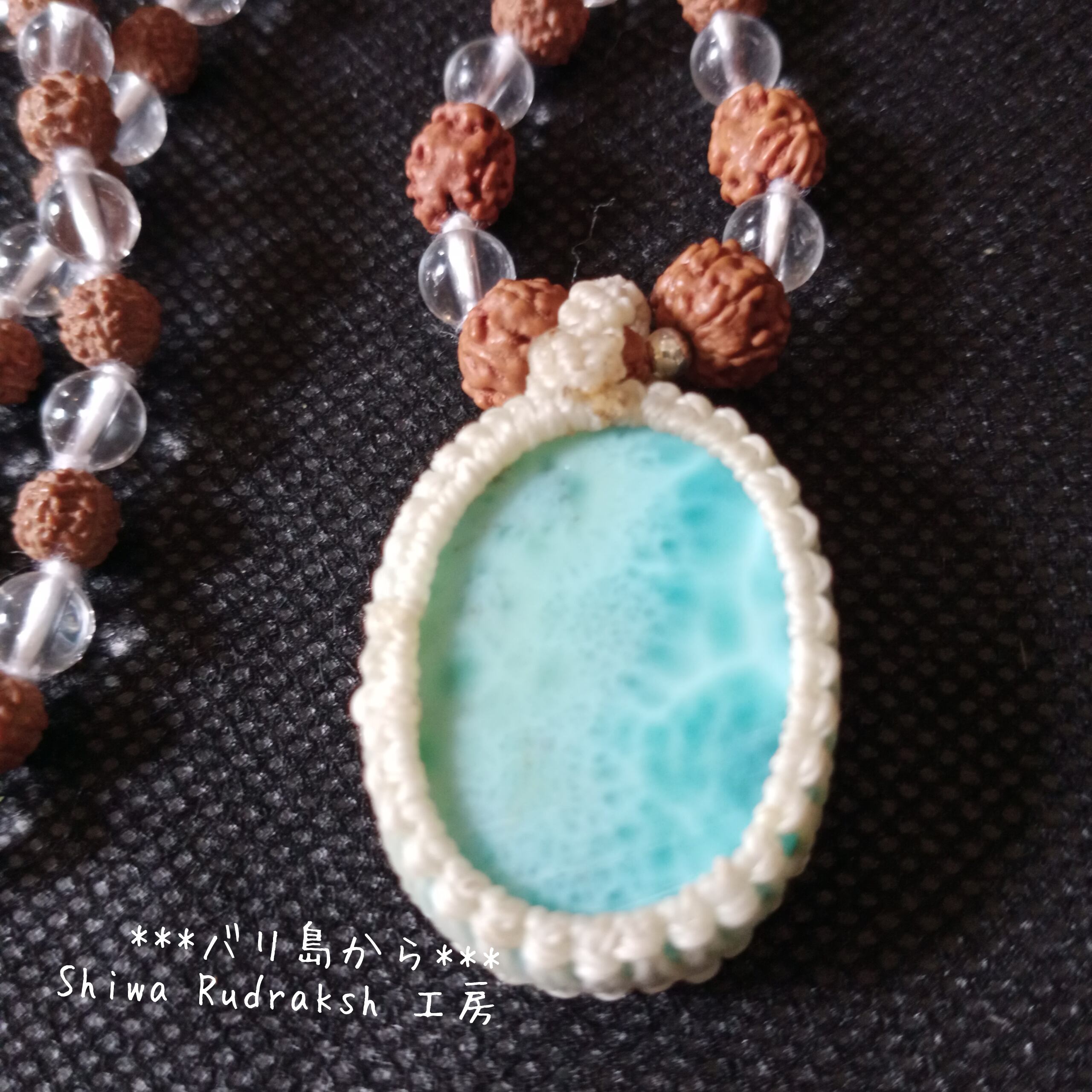 ★ルドラクシャ5面(約6mm)・ルドラクシャ2面(約縦11mm)・ルドラクシャ7面(約8mm)・クリスタル(約6mm)・ラリマー(約35mm×約27mm×約11mm)