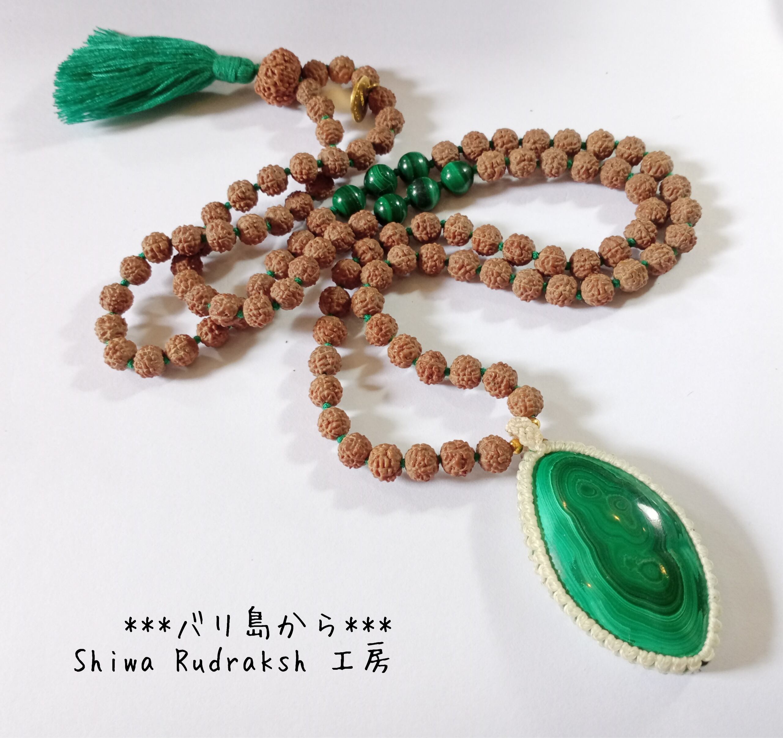 ★ルドラクシャ5面(約6mm)・ルドラクシャ10面(約15mm) ・マラカイト(約7mm)・マラカイト原石ペンダントトップ(約50mm×約25mm)