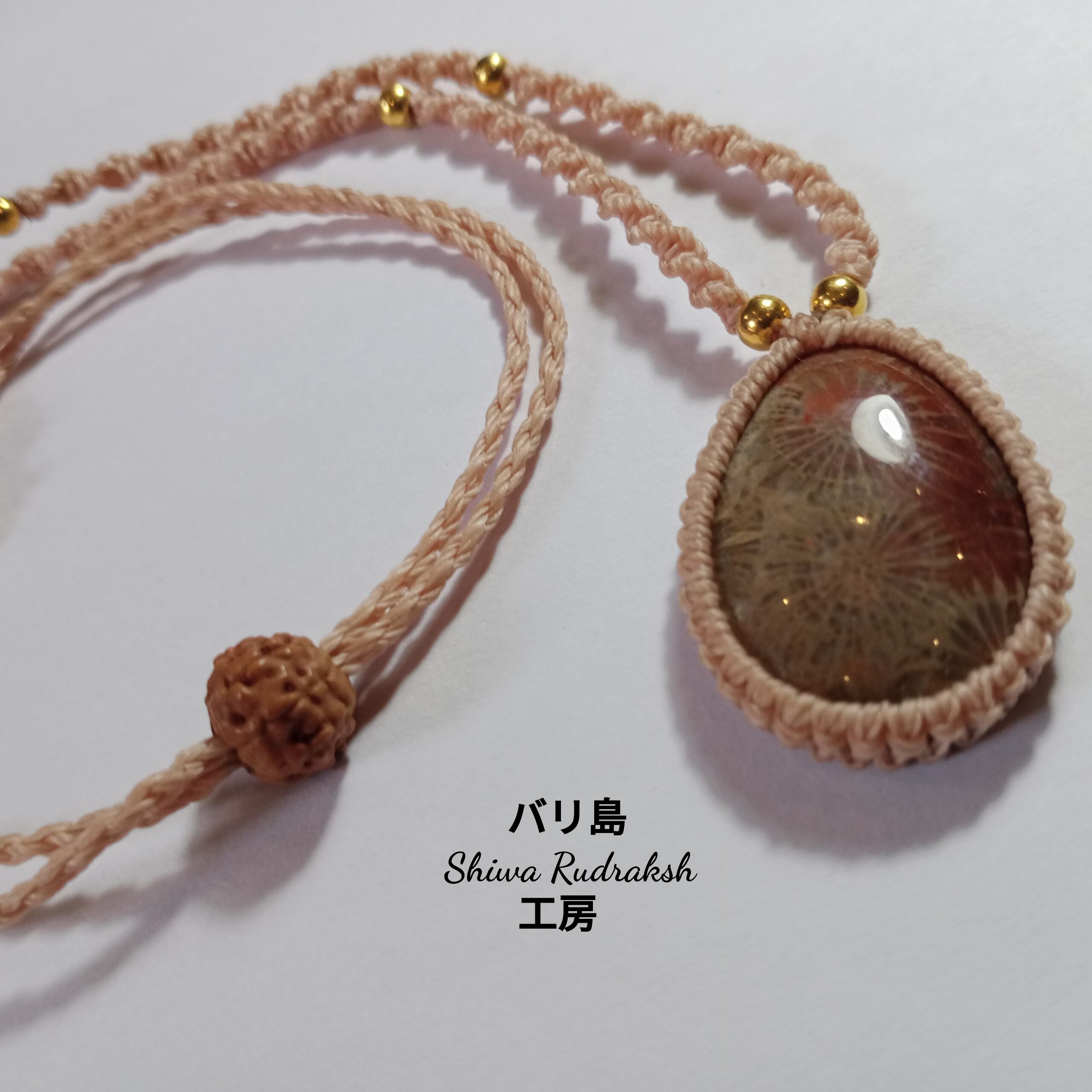 インドネシア産「フォッシル」をマクラメ加工した長さ調整可能な紐ネックレスです。