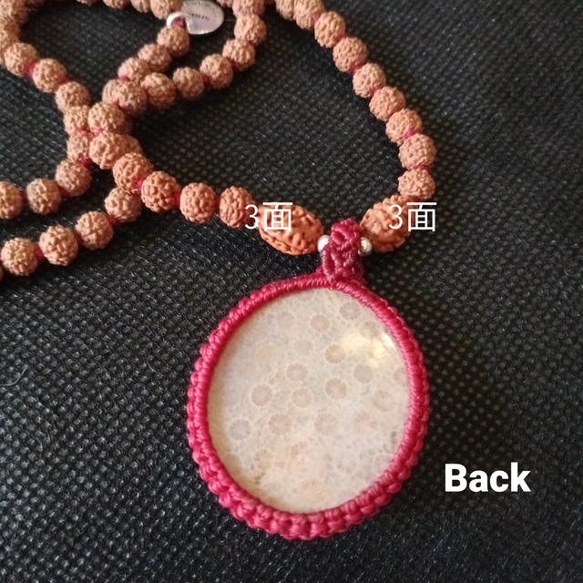 「インドネシア産」の「フォシルコーラル(珊瑚の化石)」をマクラメ加工し、ペンダントトップにした108粒のマーラーです。