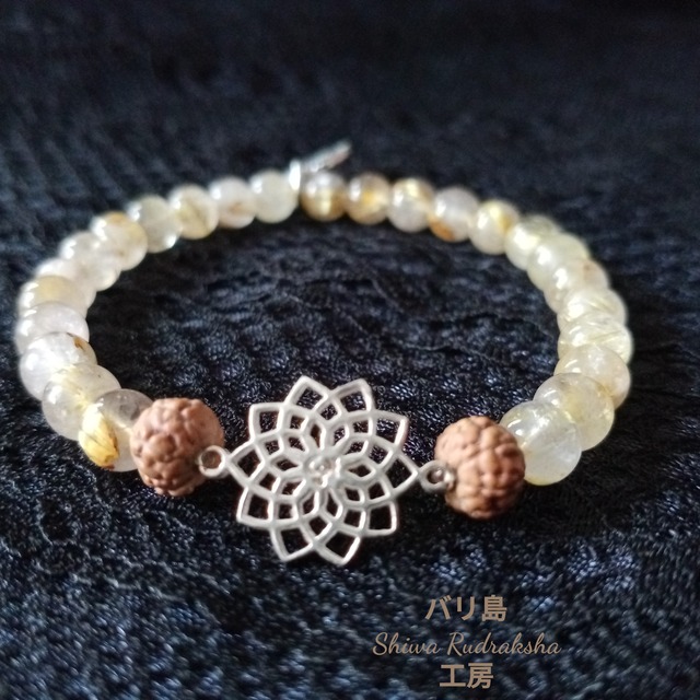 「第七クラウンチャクラ」の花のような神聖幾何学チャームと、「ルチルクウォーツ」をふんだんに使ったブレスレットです。