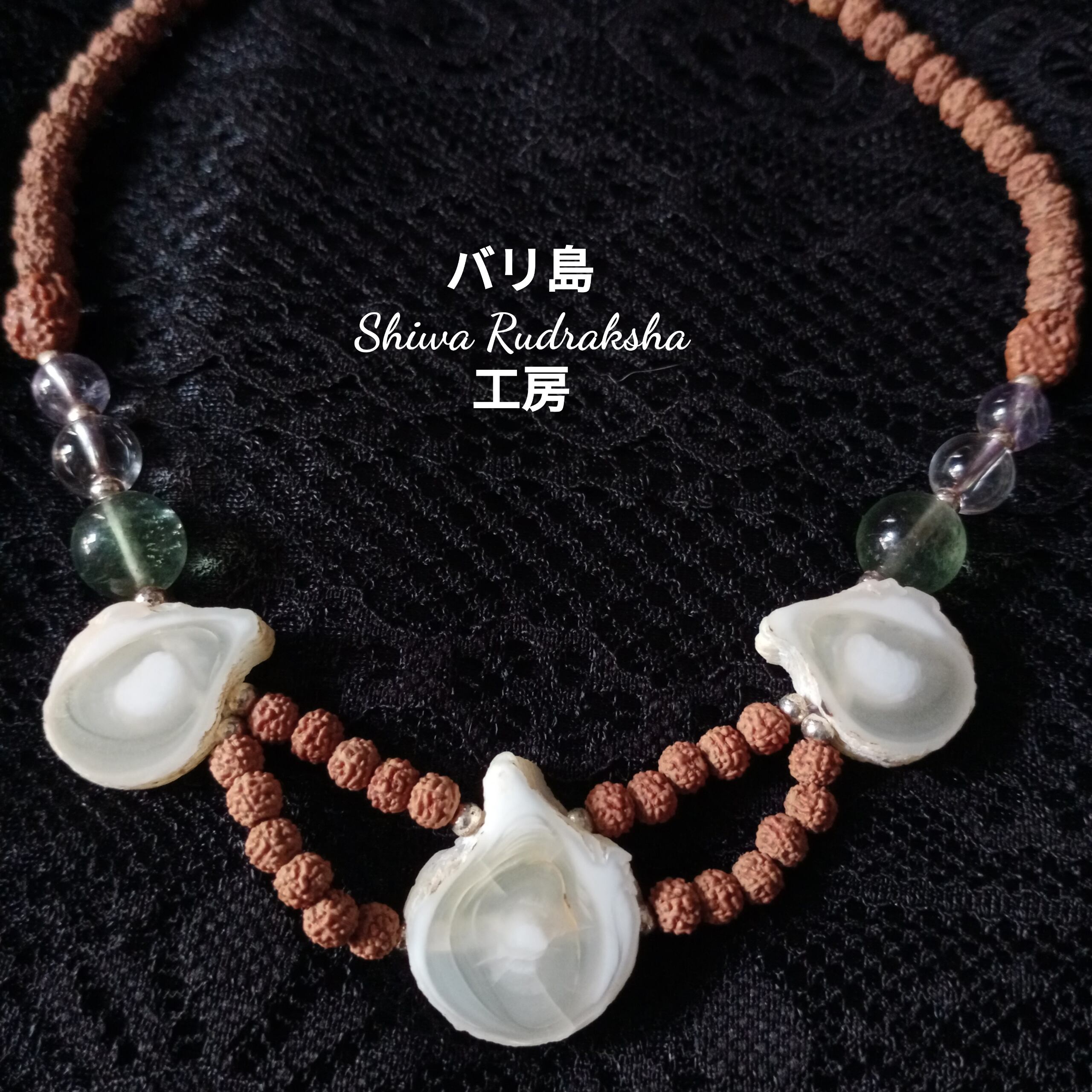 ★ルドラクシャ5面(約6mm)・ルドラクシャ3面(約縦11mm)・ルドラクシャ7面(約12mm)・クリスタル(約8mm)・アメジスト(約7mm)・フローライト(約10mm)・シルバー925ビーズ(約4mm)・ケオン茎スライス(約20mm×約15mm前後)