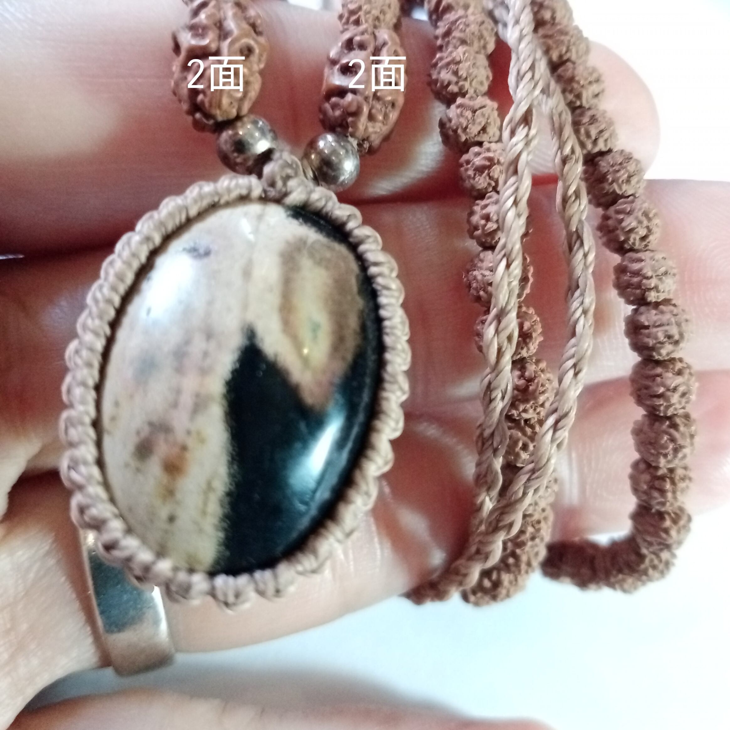 「モリンガの化石」左右に「人間関係を円滑にし、自分自身との調和を図る」と言われるルドラクシャ「2面シヴァ&パールヴァティー」を組み入れ、それ以外は極小ルドラクシャ5面を使っています。