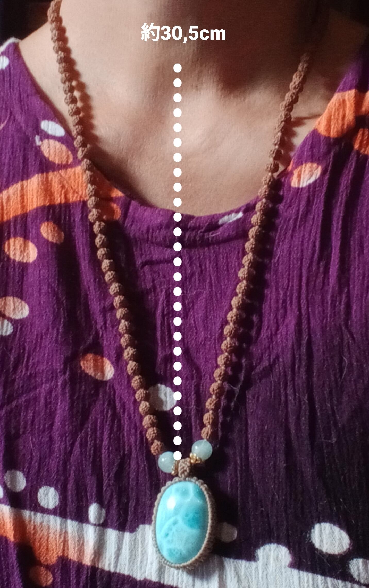 三大ヒーリングストーンの一つ「ラリマー」をマクラメ加工のペンダントトップにした108粒マーラーです。