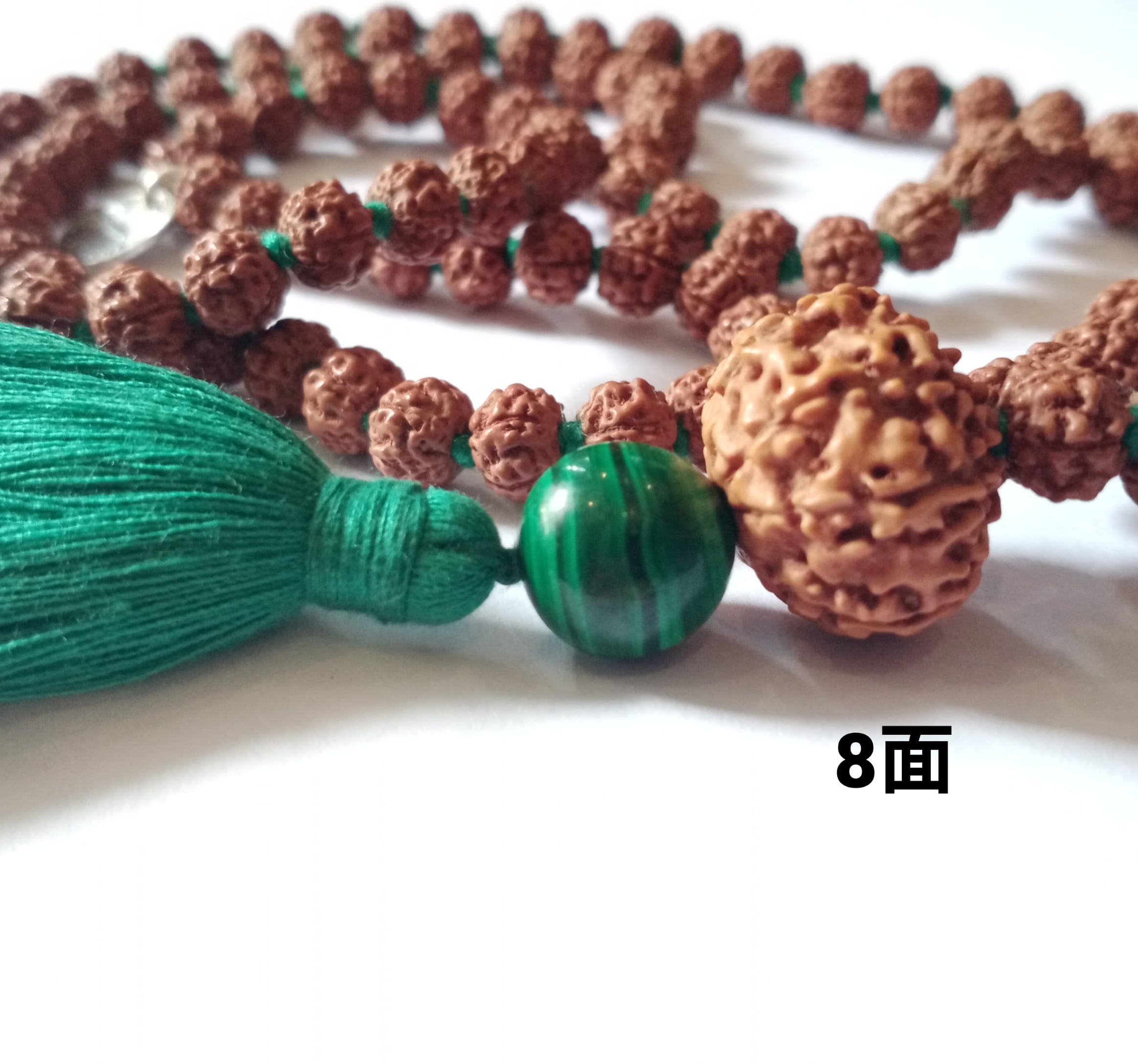 グルビーズ部分に「8面ルドラクシャ(ガネーシャ神)」とパワーストーンの「マラカイト」を付けた108粒マーラーです。